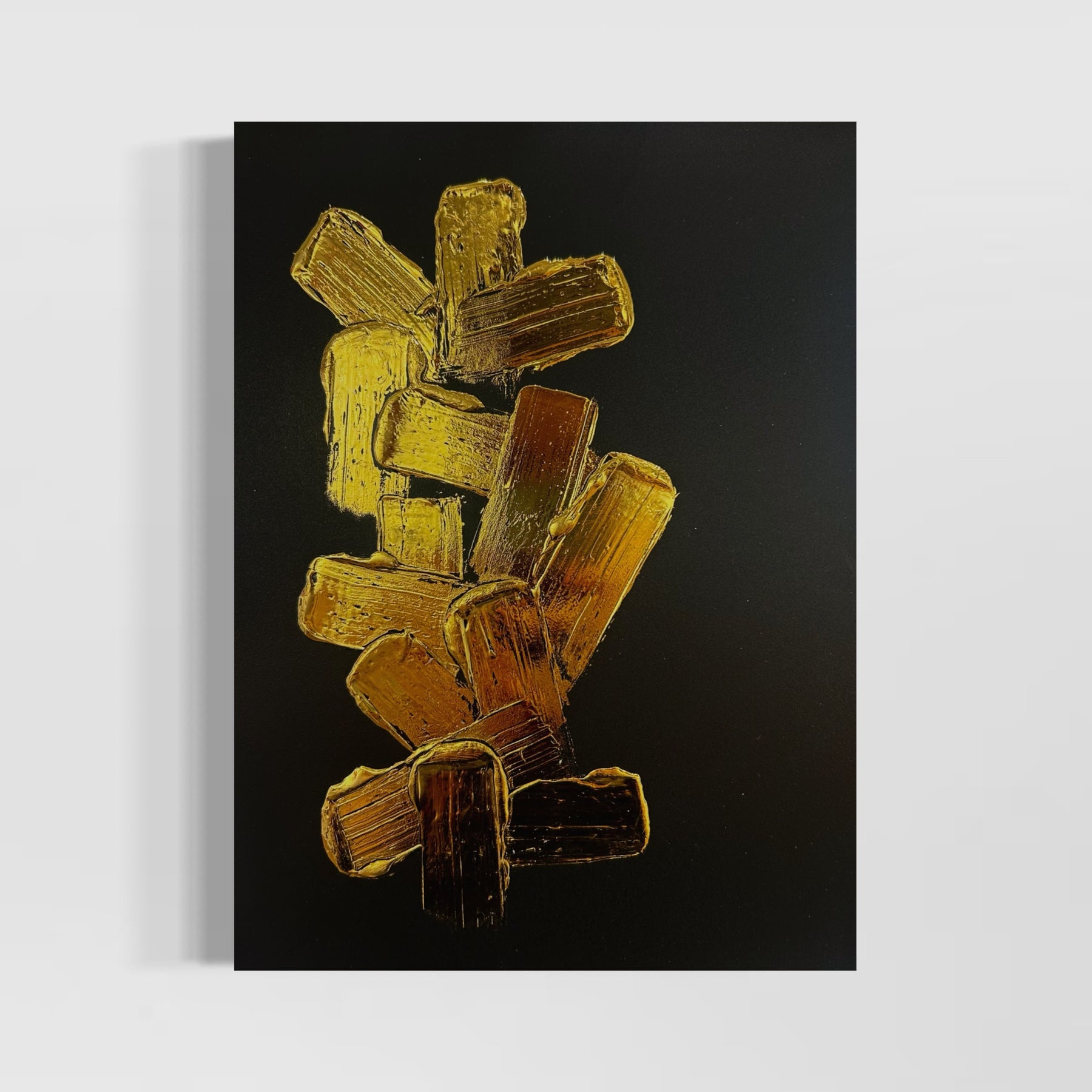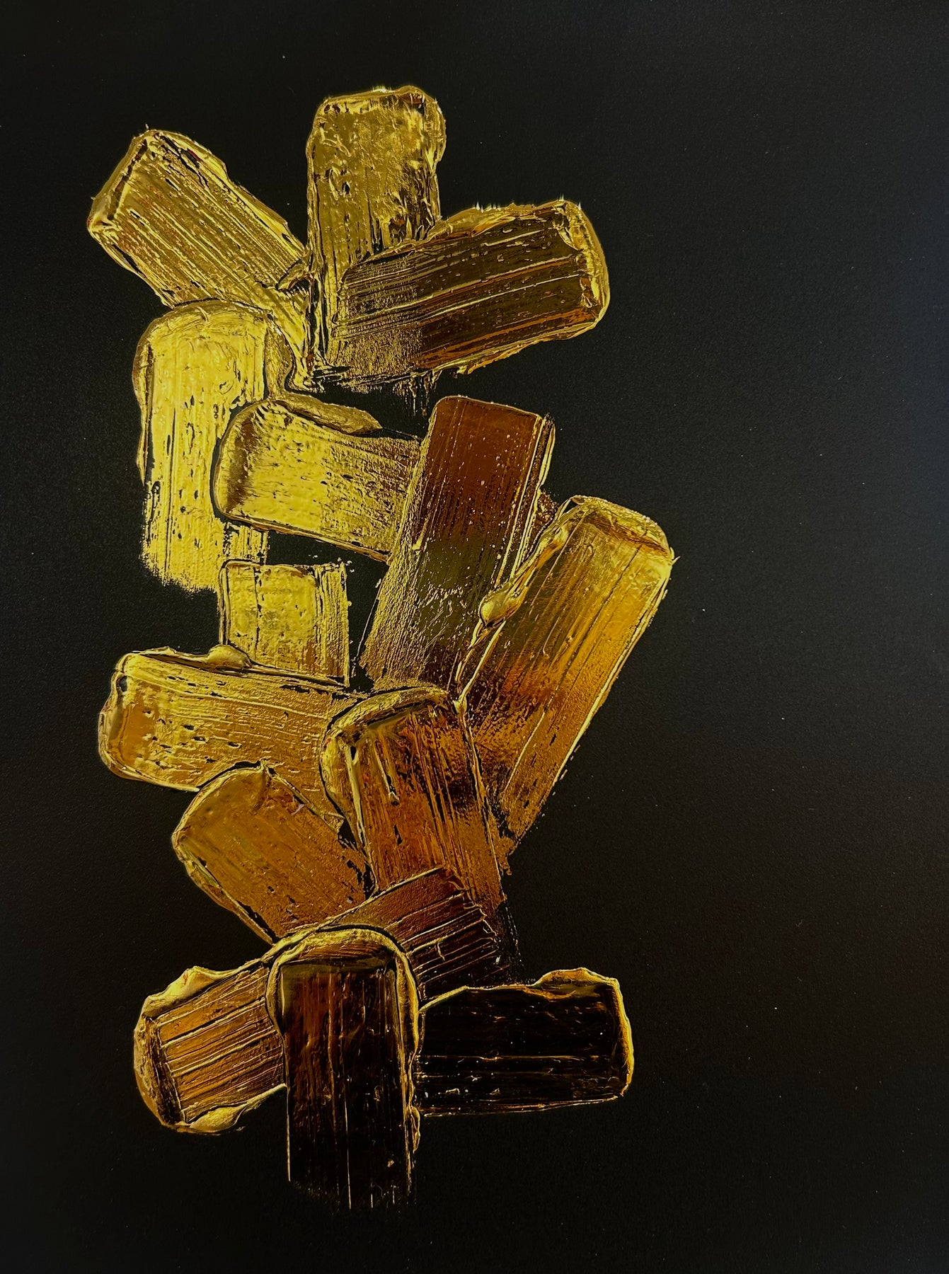 NYC based artist, M. Clark, creates light-reflecting works wherein the artist manipulates heat and pressure to fix metallic foil onto various surfaces -- there is no paint on her artworks, only gold, copper, or silver foil. Clark often uses a palette knife to help texturize her highly reflective, modern and minimalist works of art.