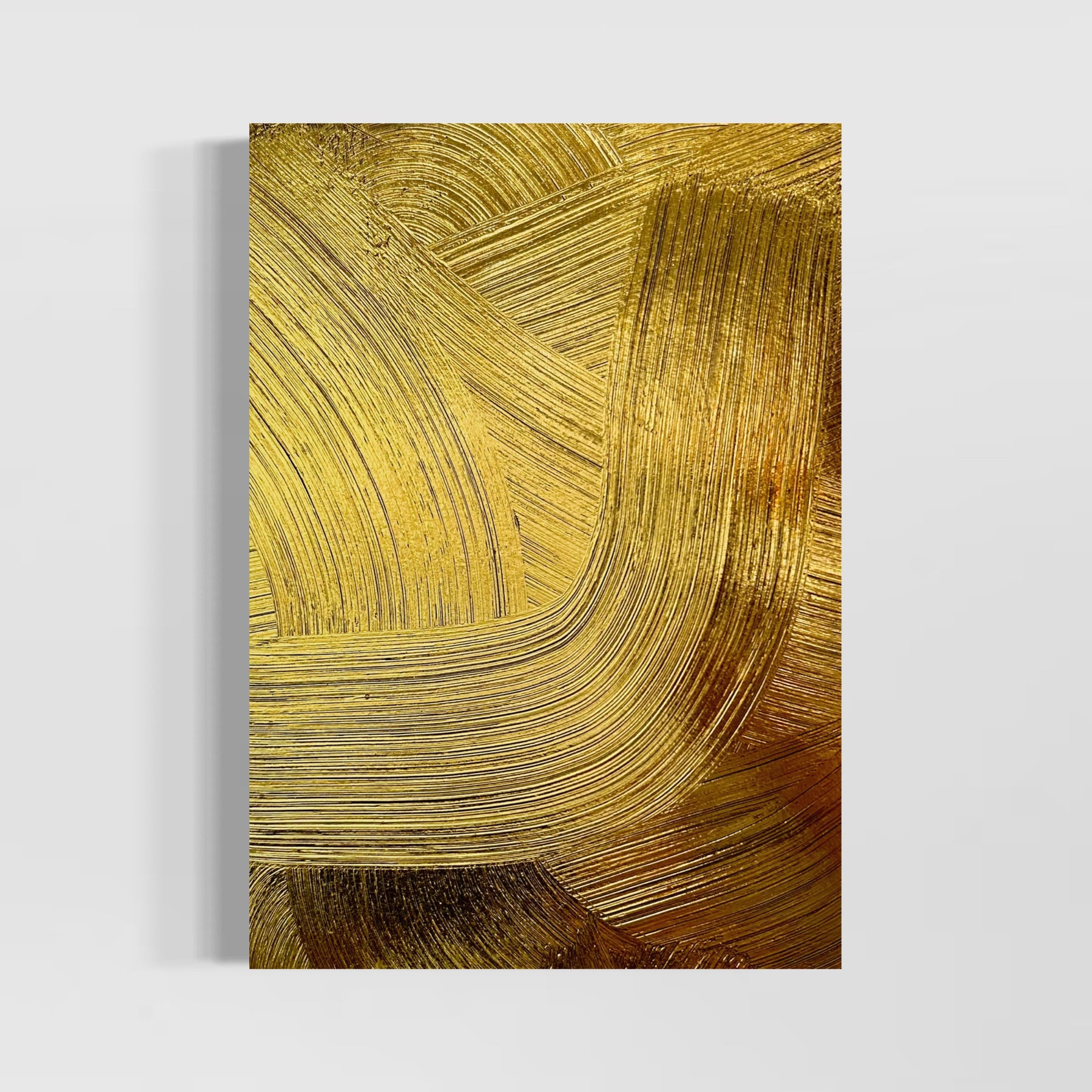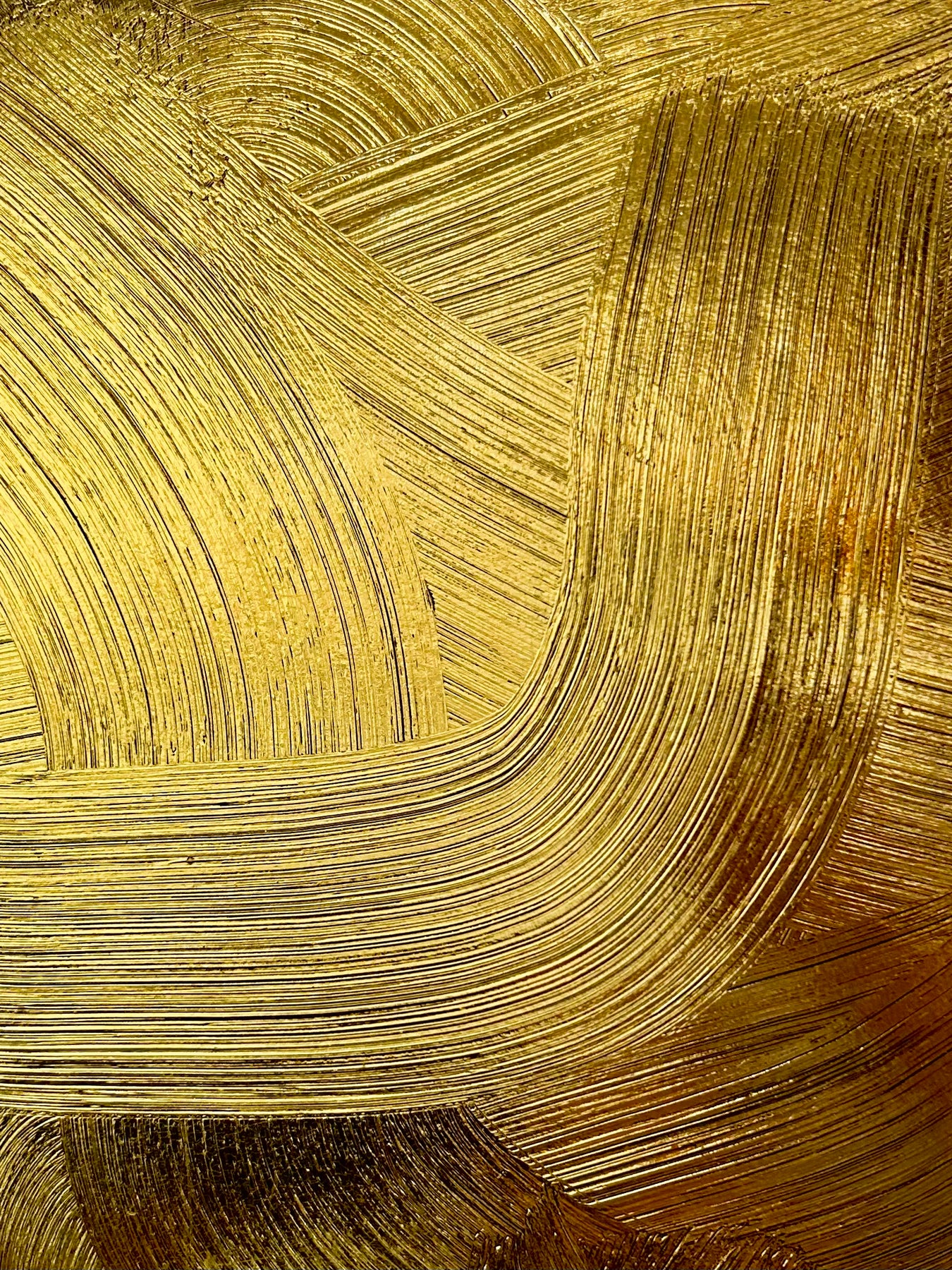 NYC based artist, M. Clark, creates light-reflecting works wherein the artist manipulates heat and pressure to fix metallic foil onto various surfaces -- there is no paint on her artworks, only gold, copper, or silver foil. Clark often uses a palette knife to help texturize her highly reflective, modern and minimalist works of art.