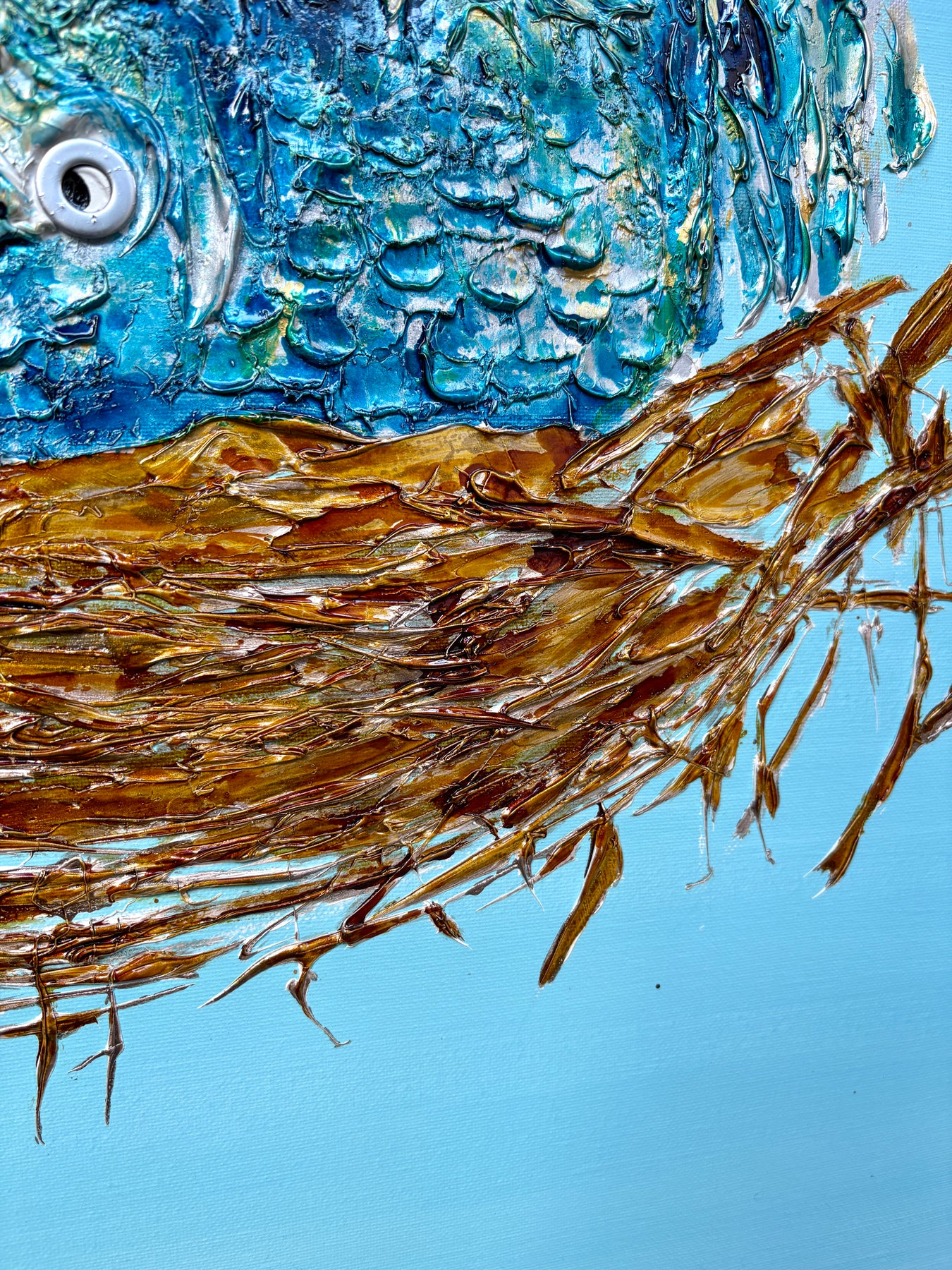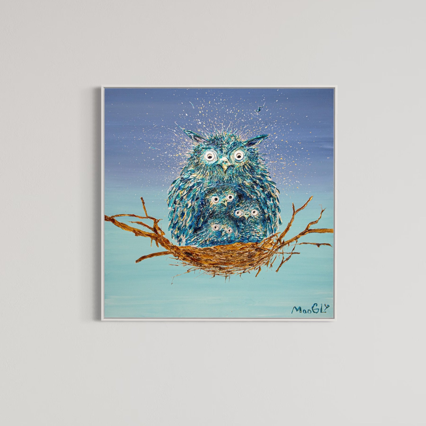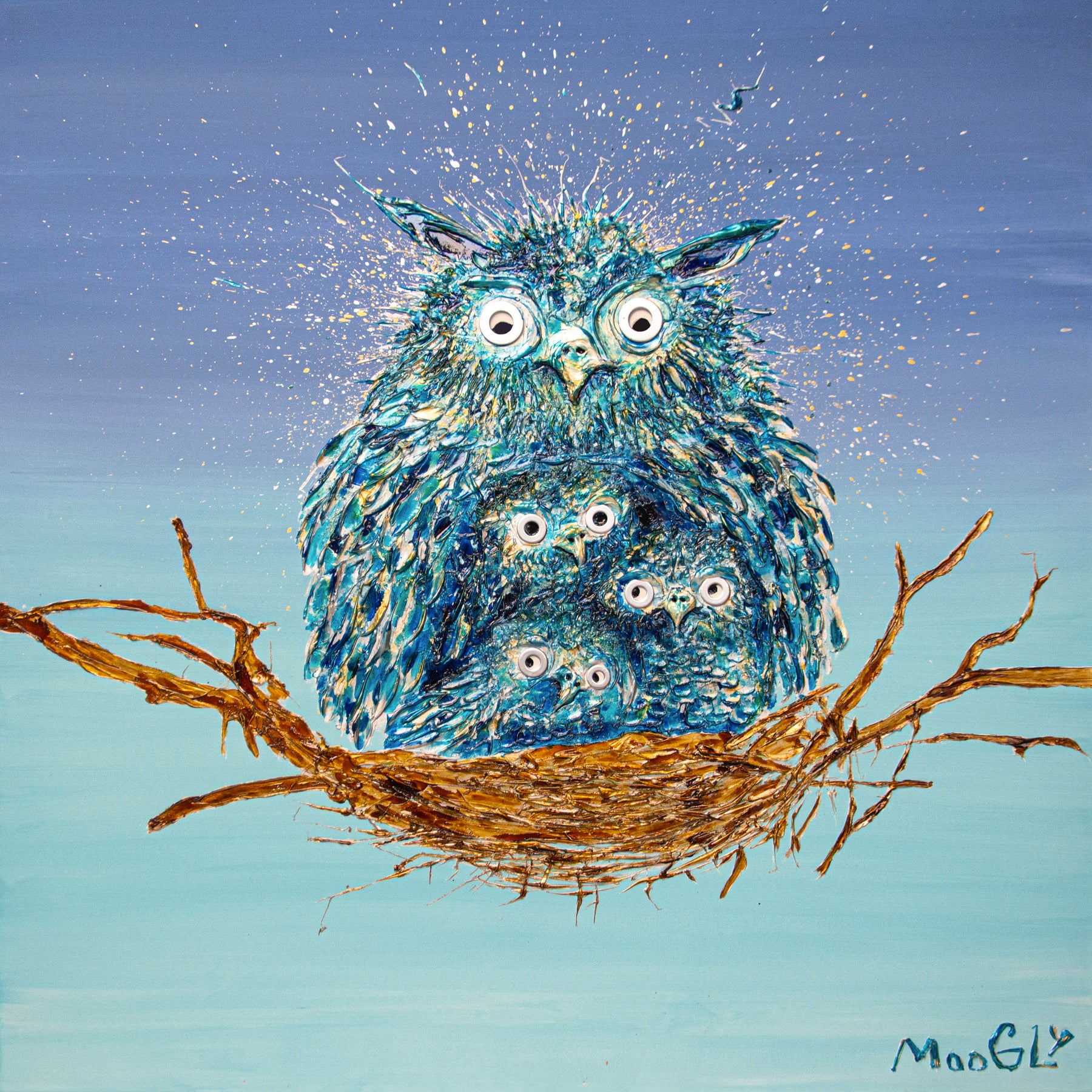 40" x 40" acrylic on canvas painting of a family of blue birds in a nest over a light to dark blue gradient background.