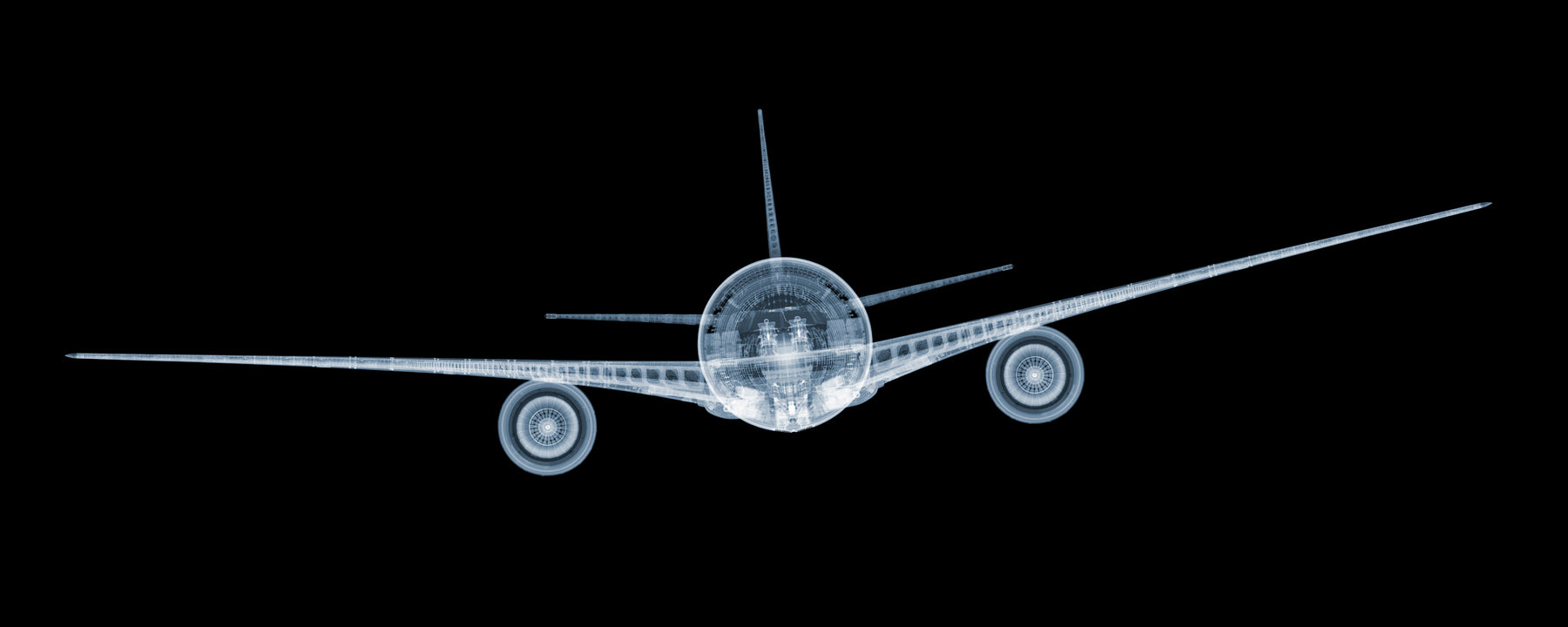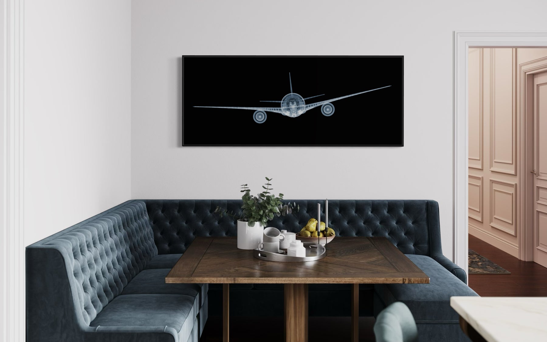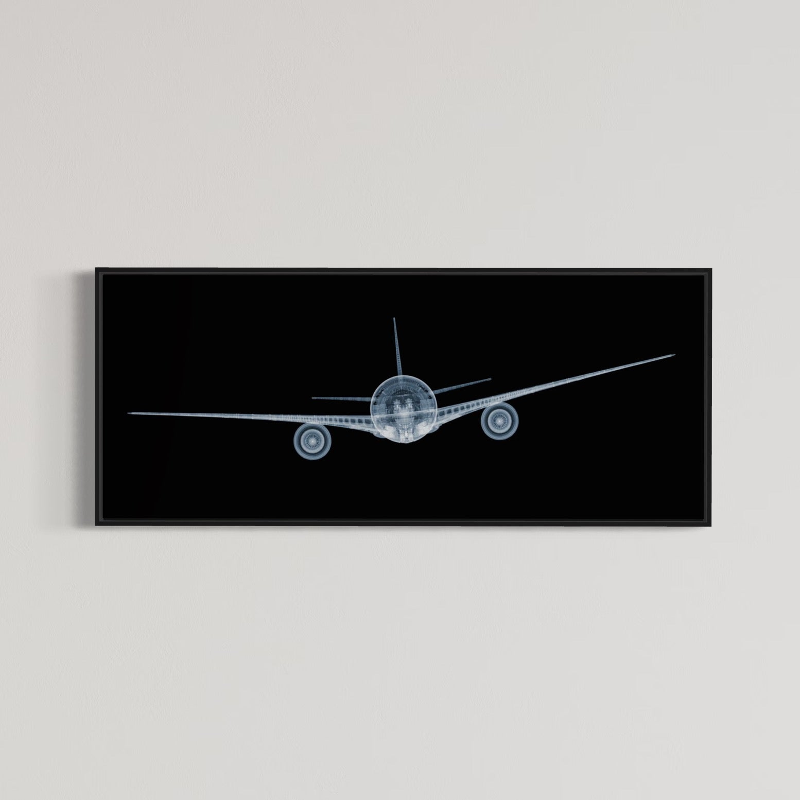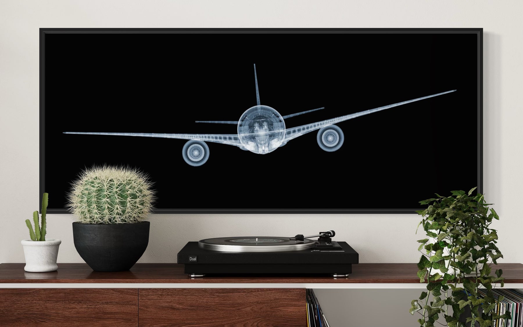 Framed Chromaluxe x-ray photograph by Nick Veasey of a mechanical jet on black background