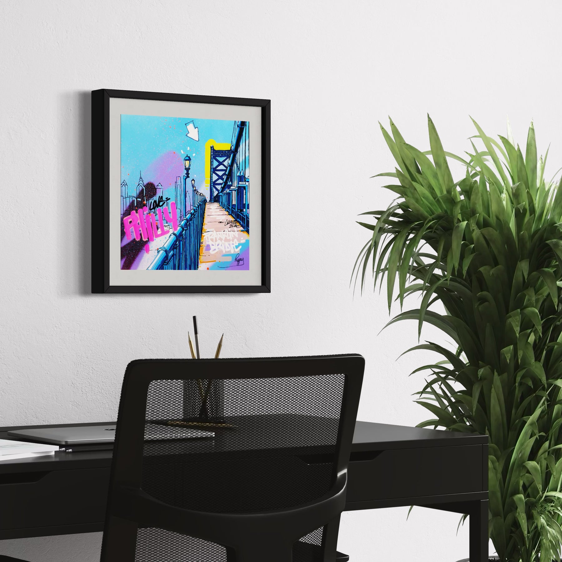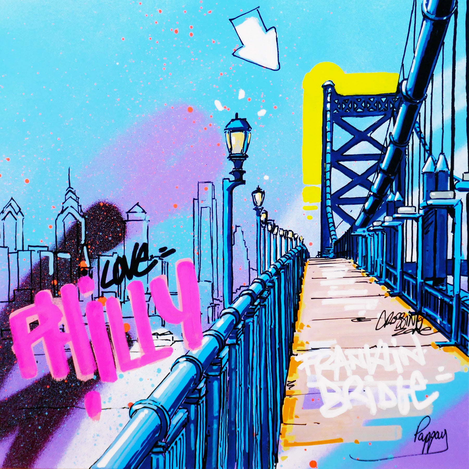 ben franklin bridge graphic pop illustration with graffiti text and skyline in blue on background