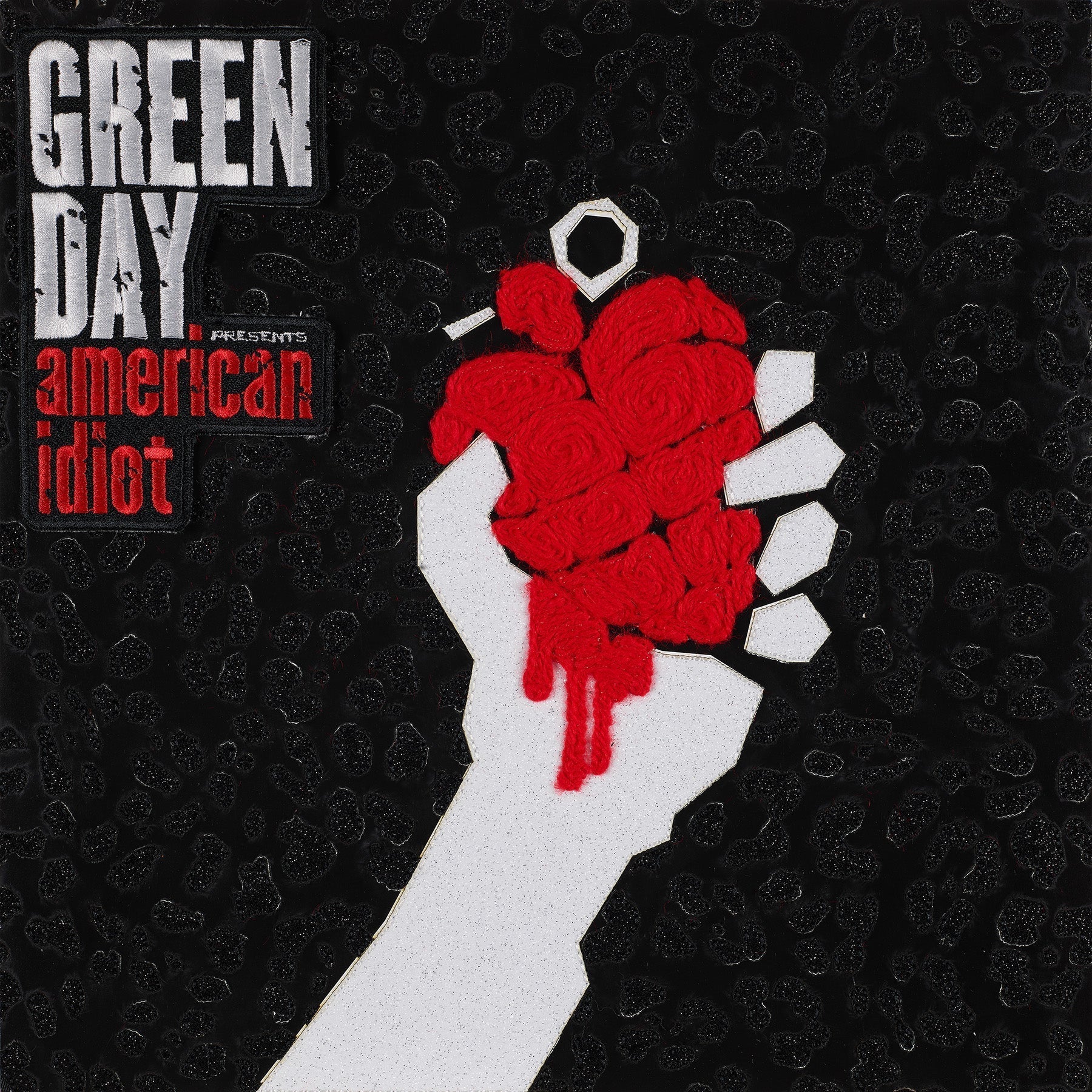 "I have been a fan of Green Day since the early days but American Idiot is my favorite album of theirs. I have always thought of this as a play. In fact, they turned it into one that ran for a few years. The graphics are great for this cover. They remind me of vintage propaganda posters from the color war. When I was creating the embroidery from the cover, I started by embroidering a leopard print pattern in the background using laser cut fabric, very punk rock. The hand and heart grenade was created using red and white yarn with the logo created as a patch." - Stephen Wilson