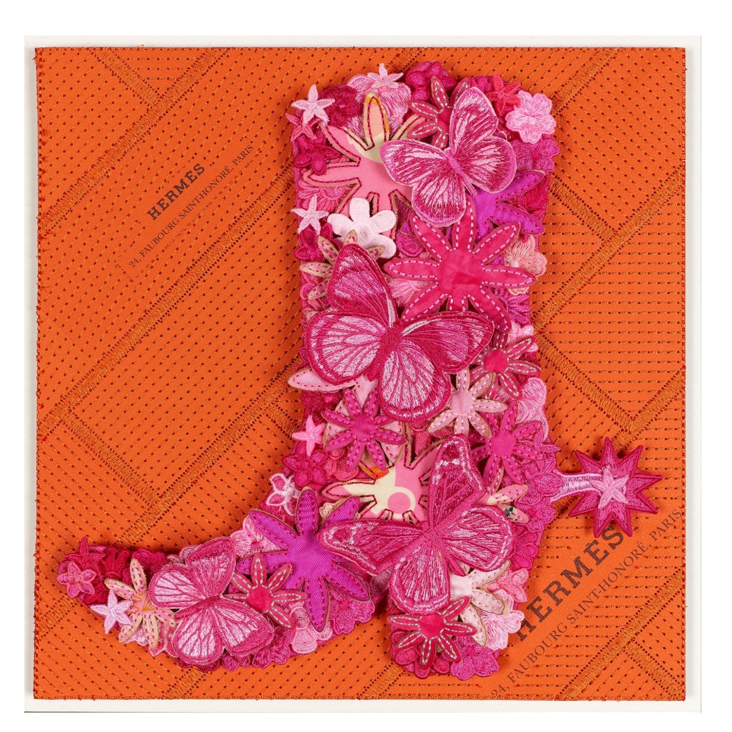 Stephen Wilson expertly crafts extraordinary and timeless designs using sustainable materials. Each art piece embarks on a journey, starting with an up-cycled luxury bag, box, silk scarf, or album. Wilson meticulously creates a bespoke embroidery design, delicately intertwining every stitch by hand. Once the design, colors, and elements are meticulously selected, the artistic process advances to the assembling stage. The boxes and bags undergo a mesmerizing transformation, metamorphosing into captivating canvases for Wilson's creations. The embroidery is seamlessly integrated into the chosen medium, unveiling a captivating texture that breathes life into the artwork. Appliqués, patches, and butterflies are individually stitched out, meticulously crafted, and delicately placed on each piece, culminating in a truly distinctive and unparalleled masterpiece. Finally, each artwork is beautifully presented, encased in an acrylic frame, ready to enchant all who behold it.