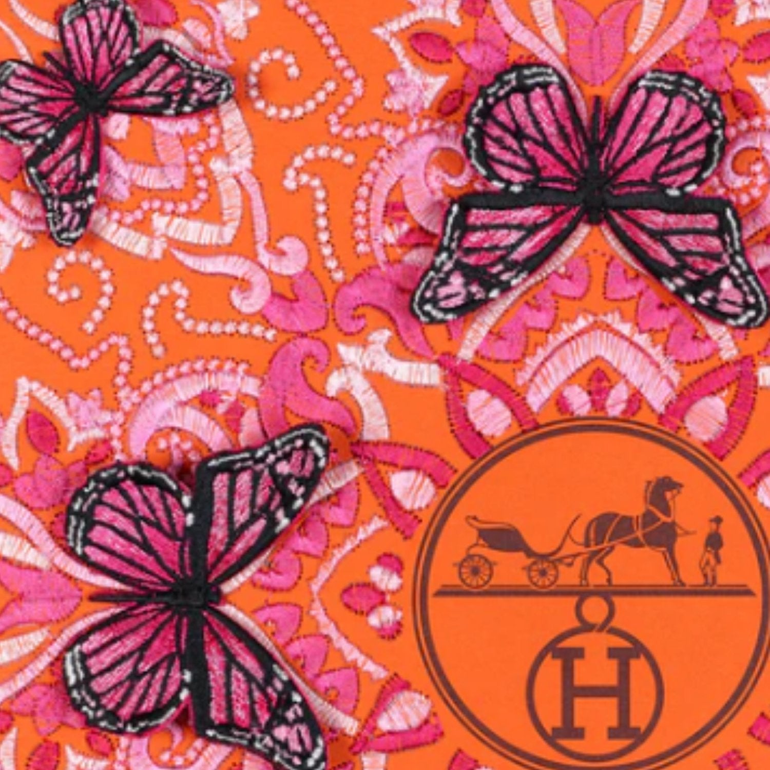 The symmetry pieces were created by first designing and embroidering a vintage bandana pattern right through a luxury box. The colors of thread that are used are always bright and vibrant. Once the embroidery is complete tonally embroidered butterflies are added to the background in a symmetric pattern. Experience the ultimate blend of art and fashion with Custom Symmetry.