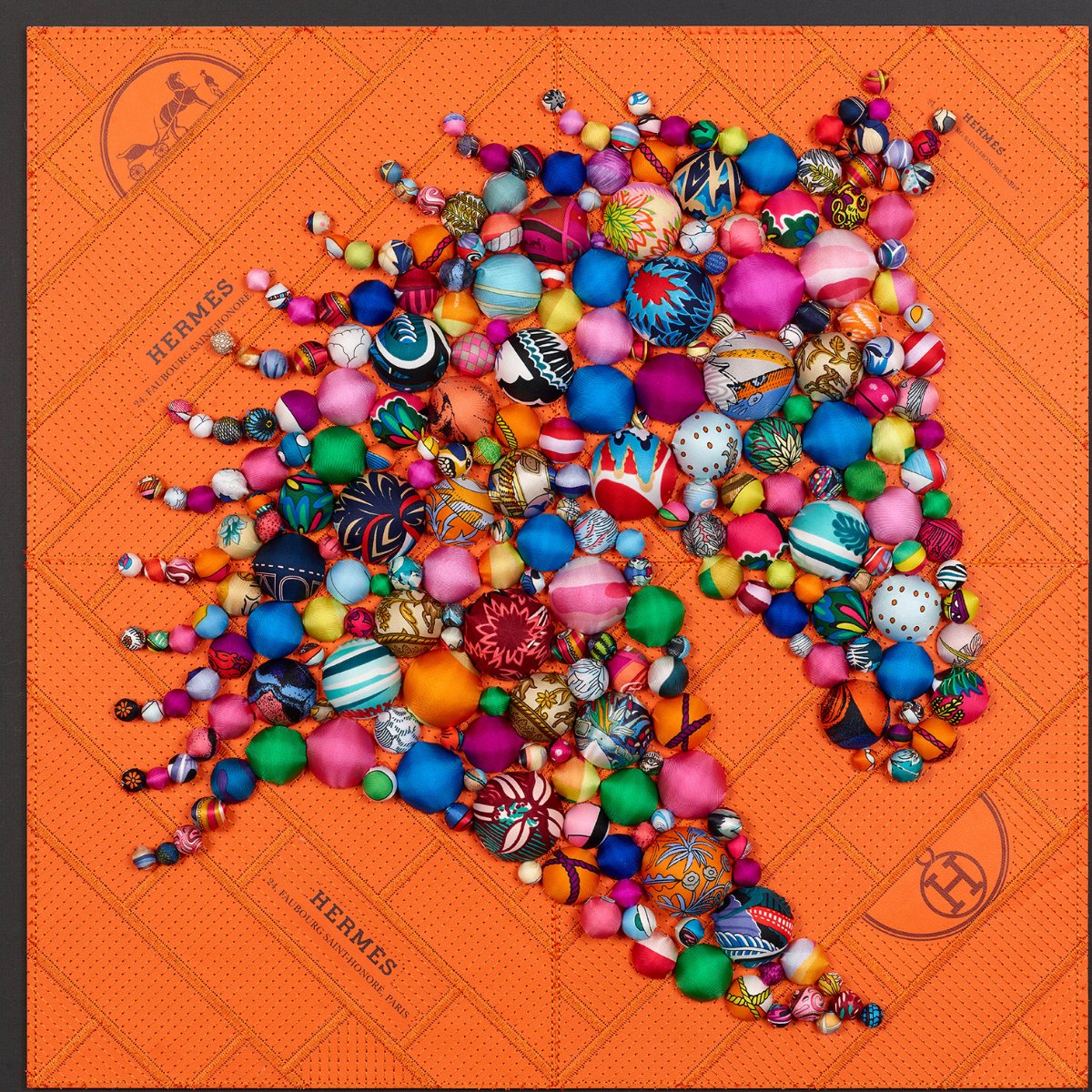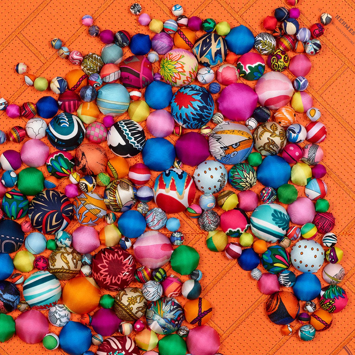 • Hermes box embellished with embroidery and pom poms made of up-cycled silk scarves