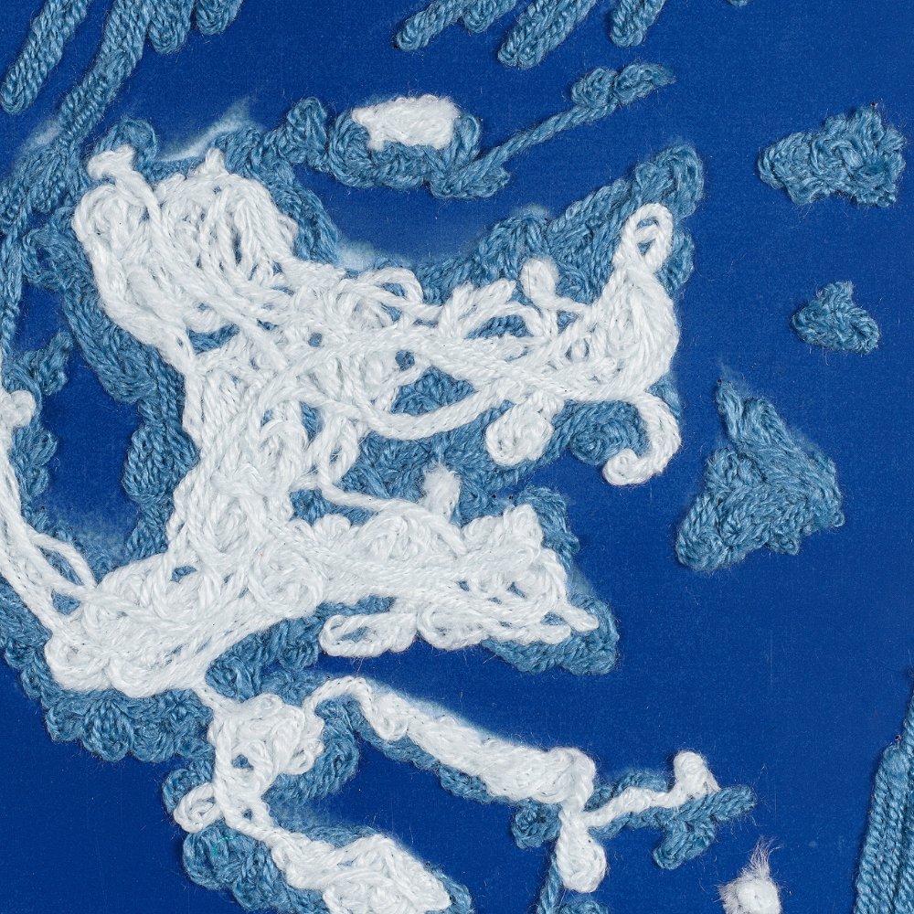 "Blue is one of the top rated albums of all time by a female artist. When I was younger, my taste in music was in a decidedly different vein than Joni Mitchells music. I had of course heard her, she was on my mother's playlist along with Neil Diamond and Barbara Streisand. It was later in life that I re-discovered her music and as an adult I appreciated it differently that I ever could as a teenager. Blue is a timeless album that should be any music aficionados collection. The cover is a stylized photograph of Joni and I wanted to embellish the photo with hand dyed yarn embroidery. When planning the piece, I had just acquired a specialized yarn embroidery machine that I had shipped in from Japan and this is the first project that I created with it. The textural yarn looks amazing against the flat blue background of the album cover." – Stephen Wilson