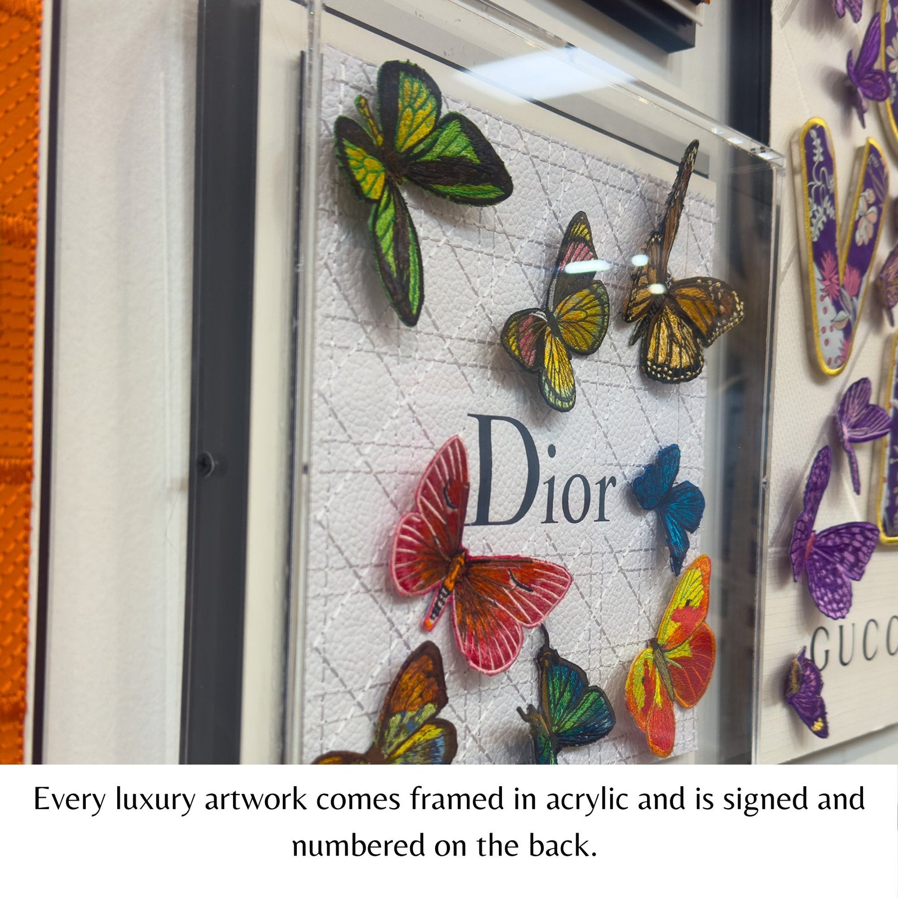 Stephen Wilson expertly crafts extraordinary and timeless designs using sustainable materials. Each art piece embarks on a journey, starting with an up-cycled luxury bag, box, silk scarf, or album. Wilson meticulously creates a bespoke embroidery design, delicately intertwining every stitch by hand. Once the design, colors, and elements are meticulously selected, the artistic process advances to the assembling stage. The boxes and bags undergo a mesmerizing transformation, metamorphosing into captivating canvases for Wilson's creations. The embroidery is seamlessly integrated into the chosen medium, unveiling a captivating texture that breathes life into the artwork. Appliqués, patches, and butterflies are individually stitched out, meticulously crafted, and delicately placed on each piece, culminating in a truly distinctive and unparalleled masterpiece. Finally, each artwork is beautifully presented, encased in an acrylic frame, ready to enchant all who behold it.