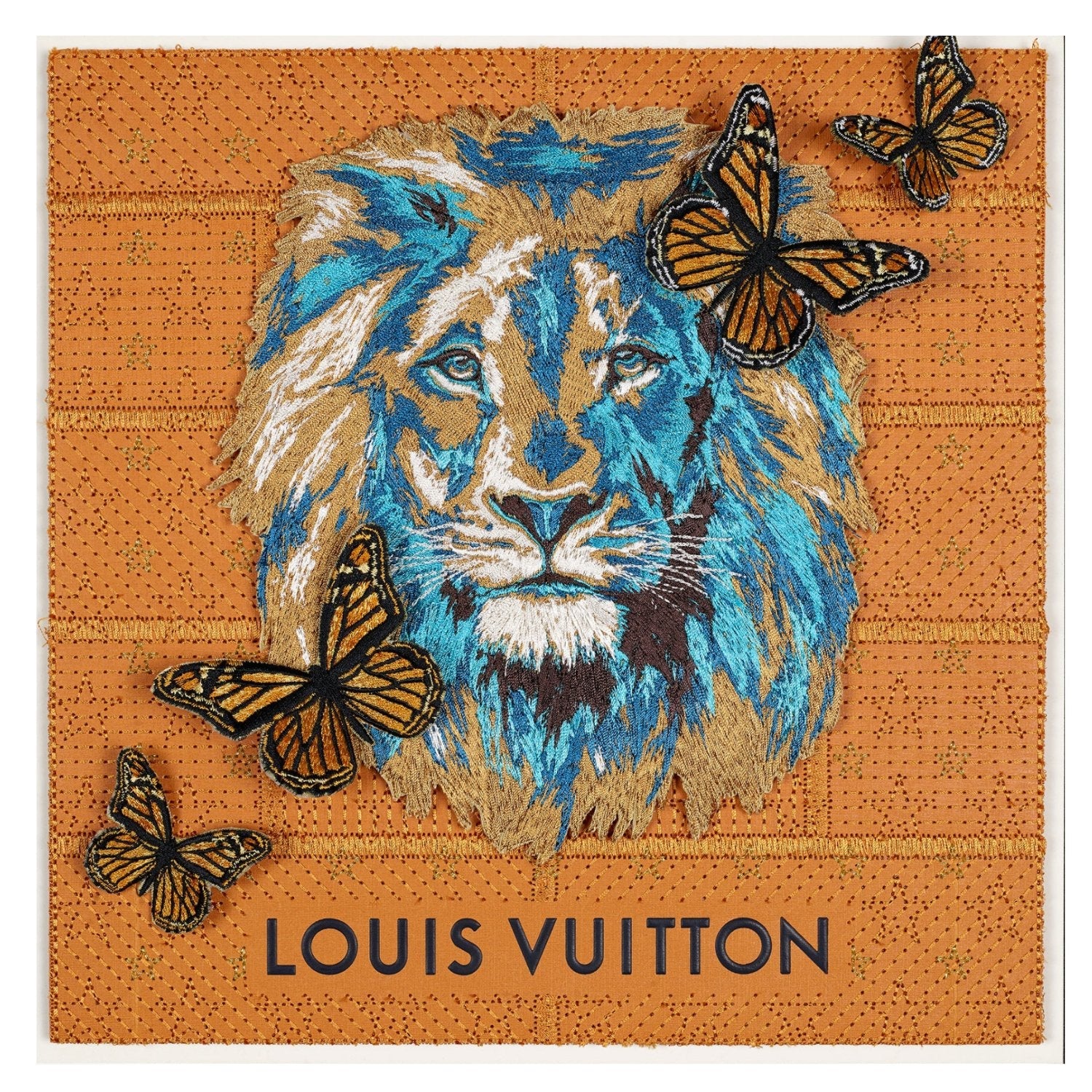The lion represents strength and was one of the first large scale pieces that Stephen created in this series. The background is created using a single luxury bag or box decorated with stars or other decorative details and the lion is created entirely from thread. Once the lion is embroidered it is mounted in relief off of the background. The Lion pieces are available using the packaging from any brand and in multiple color variations. This is a truly customizable piece.