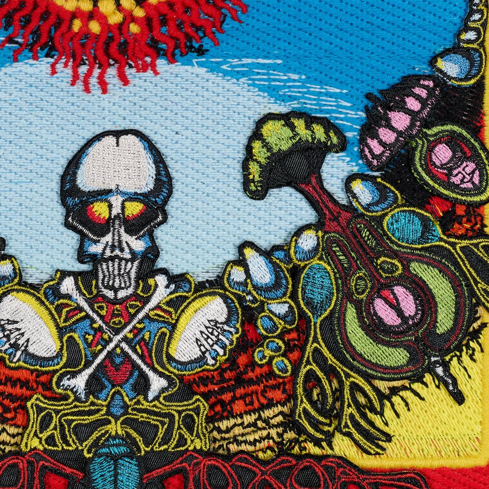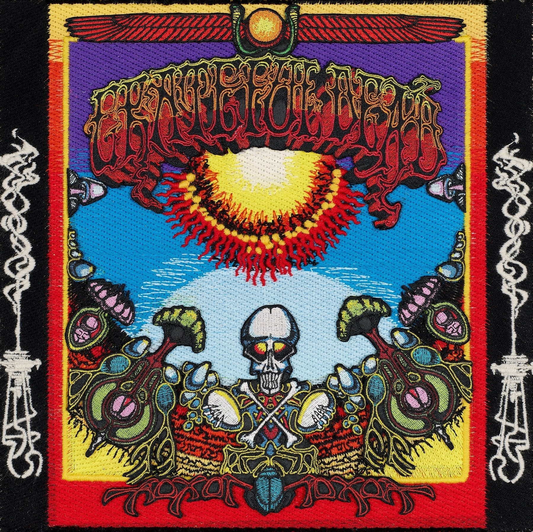 "This album pronounced, "ox-oh-mox-oh-ah," was released in 1969 and was a series of firsts for the Grateful Dead. It was the first album recorded in 16 tracks, brand new technology for the time, the first to feature lyricist Robert Hunter who would become a longtime collaborator with the band and also first to feature acoustic arrangements. The title of the album is a palindrome which according to the band means nothing, it just looked cool. When I looked at this album and tried to figure out how to recreate it in thread and textiles I was completely overwhelmed. This is the most detailed album that I have ever recreated. The background reminds me of a multicolor sunset with gradient blues and reds with an exploding sun. The logo is in multi color extruded lettering and there are scarabs, skulls, mushrooms and trees all over the cover. A lot of detail is an understatement. i started by deconstructing the album in background elements and foreground elements. I stitched the whole background in bright colors of yarn and then accented the yarn stitching with rayon thread detail and highlights,. The background has over 50,000 stitches. All of the foreground elements were created as a series of patches, each one individually created and hand digitized, hand trimmed and then collaged onto the album. The patches have over 150,000 stitches by themselves and combined with the background makes this the most stitch intensive album so far." – Stephen Wilson