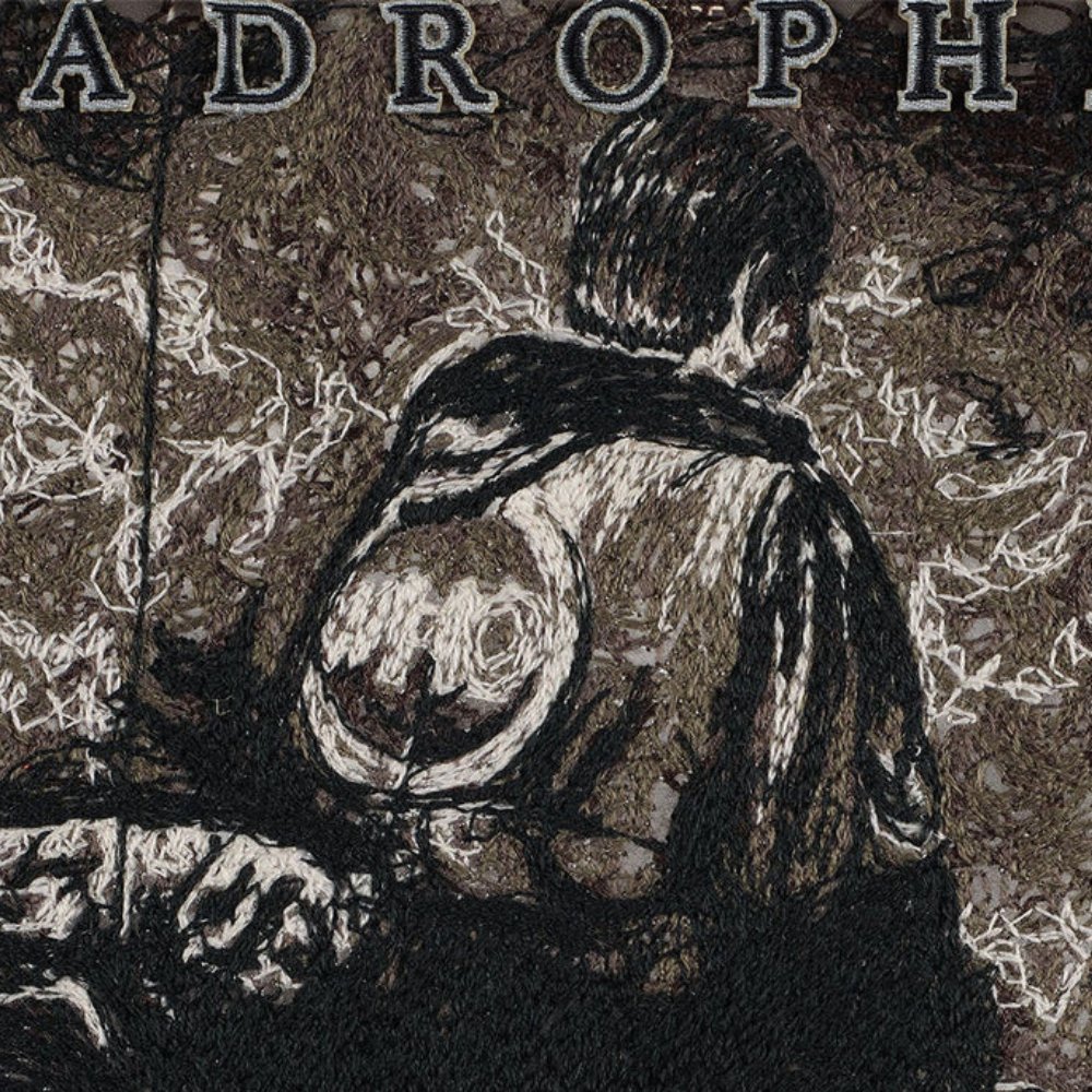 "Released in 1973, Quadrophenia was an album whose tracks held a larger meaning collectively. The double album actually inspired the making of a film of the same name. The name Quadrophenia refers to the diagnostic term schizophrenia, to reflect the four distinct personalities of the opera’s protagonist. It is also a play on the term “quadrophonic sounds.” The visuals for the album cover is the back of the main character of the story standing on a motorcycle surrounded by smoke. The pictures of the band are hidden in the rear view mirrors of the motorcycle and the text surrounds the main image on all 4 sides. Since the image is black and white with lots of swirling smoke I decided to embroider this with multiple layers of abstract tonal threads. I used different threads; wool, cotton, rayon and polyester. The different threads create nice textural variations. The lettering was created as patches and then mounted to the album last." – Stephen Wilson