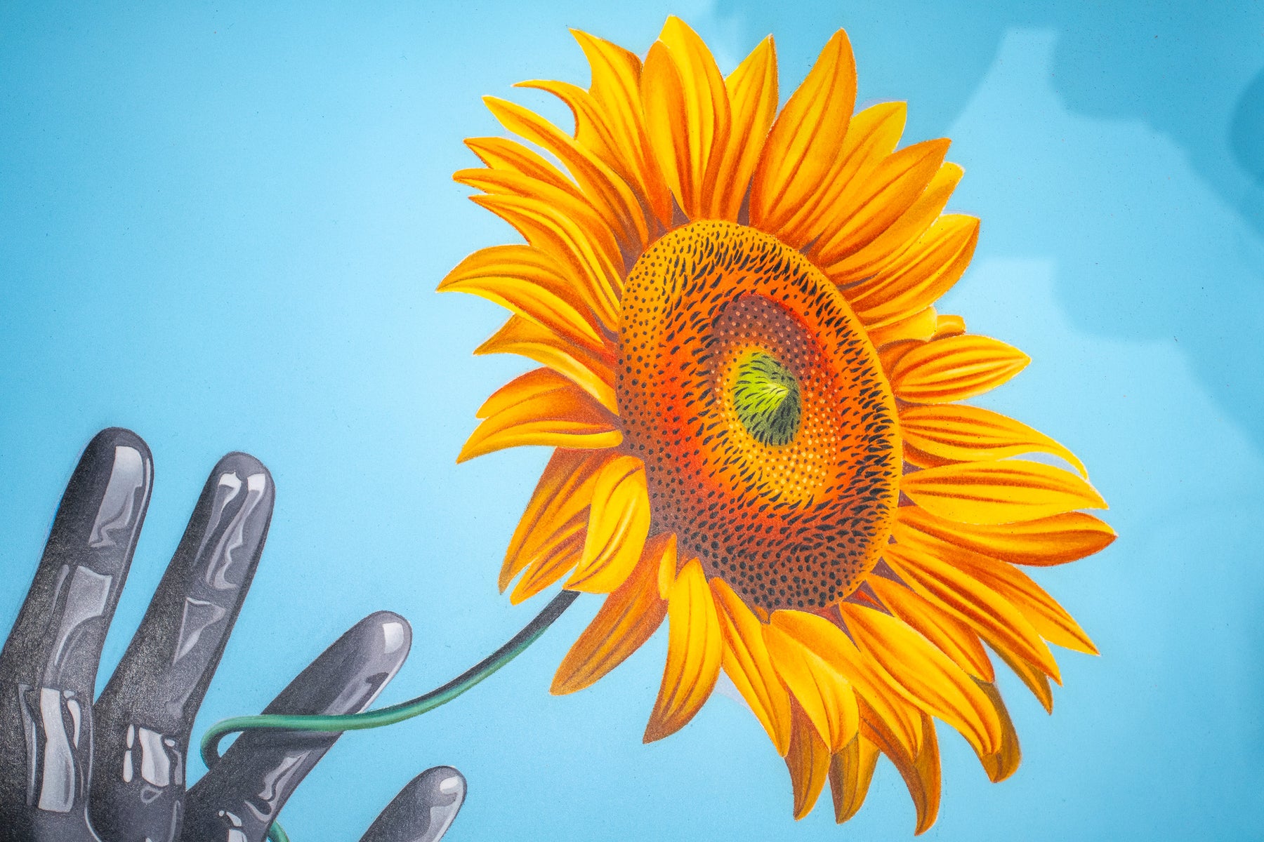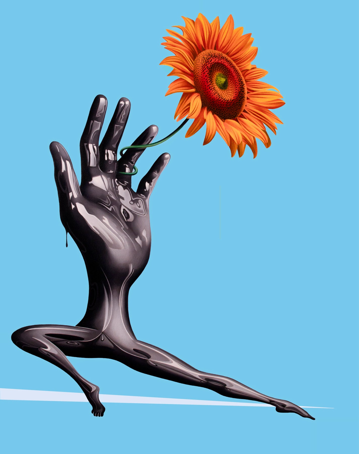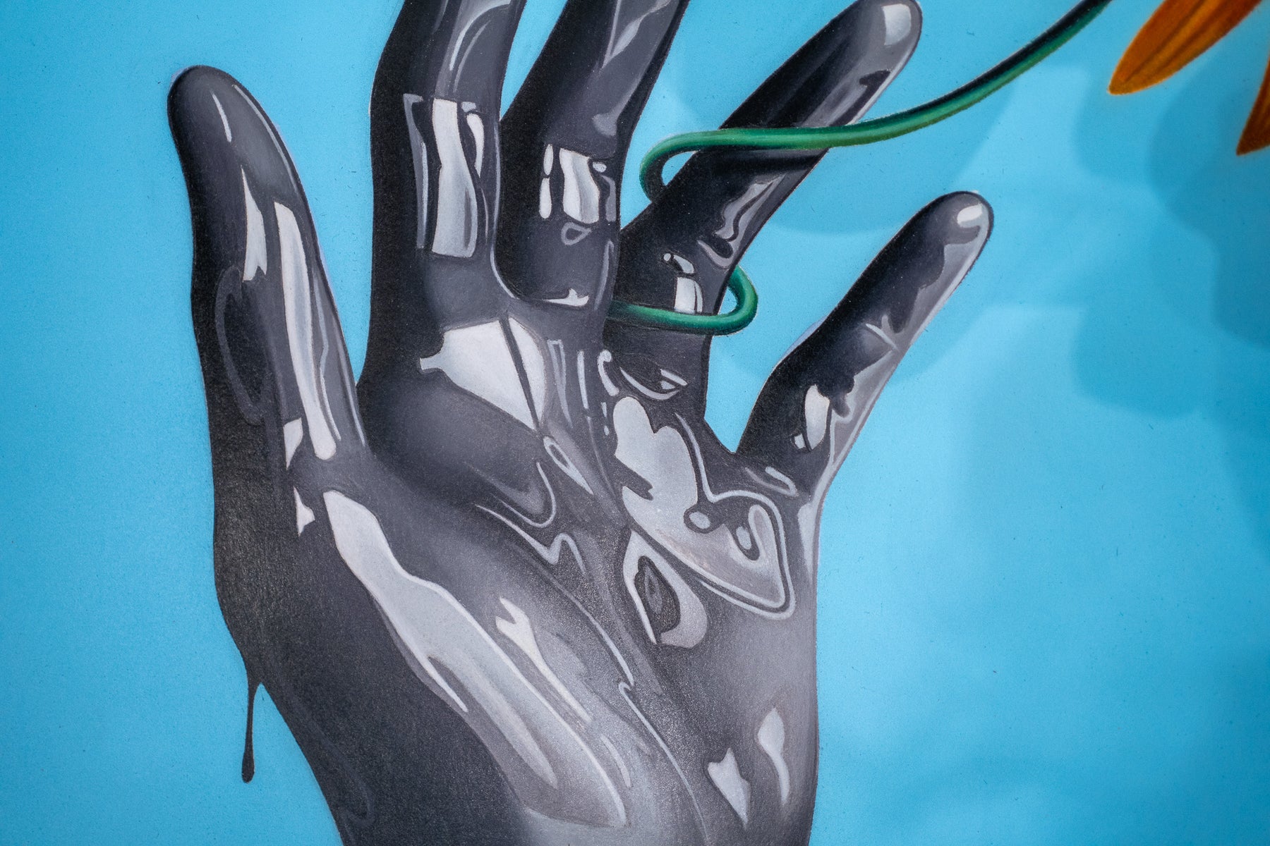 Tanner Valant creates hyper-realistic, unexpected image pairings—fish swim around M.C. Escher-like spheres, paint-dripping hands hold bonsais, and classical busts are drenched in mercury-like liquid—challenging viewers to explore themes of balance, duality, and human interaction through dark, mystical elements. At just 19, Valant, an emerging artist at the Art Institute of Chicago, achieves stunning precision using colored pencils, pens, airbrushes, and markers. As his technique evolves, he aims to engage critically with society, incorporating familiar objects to reflect our changing world.