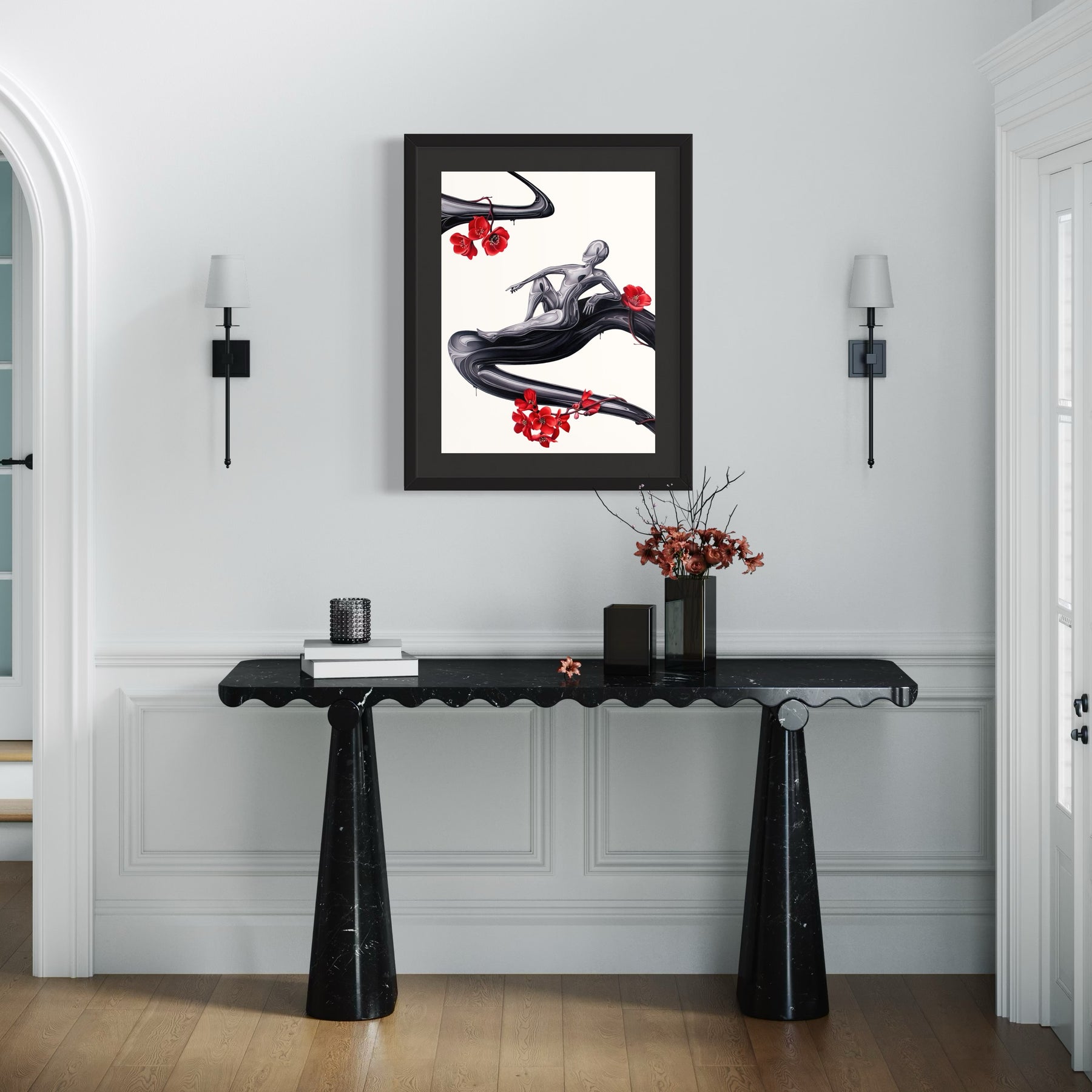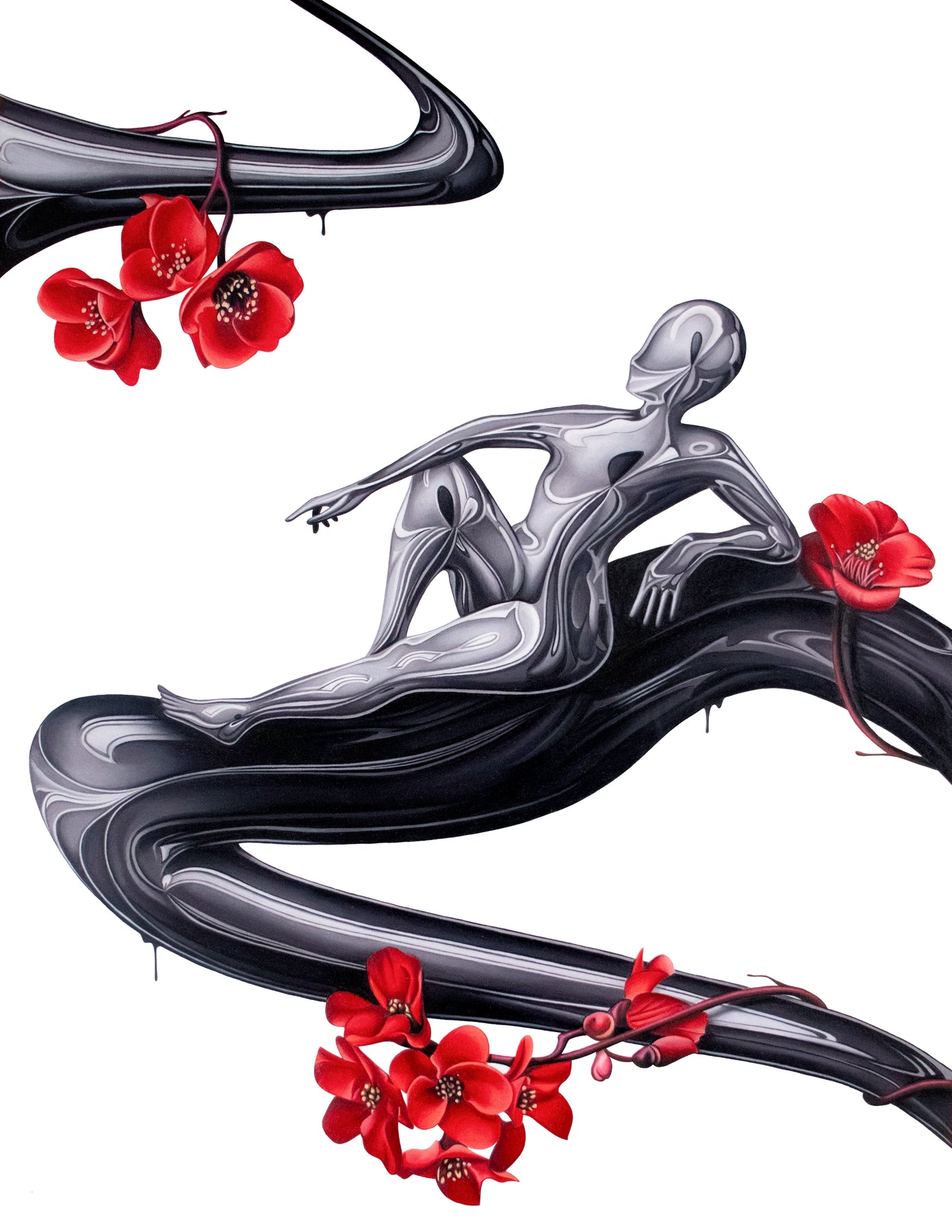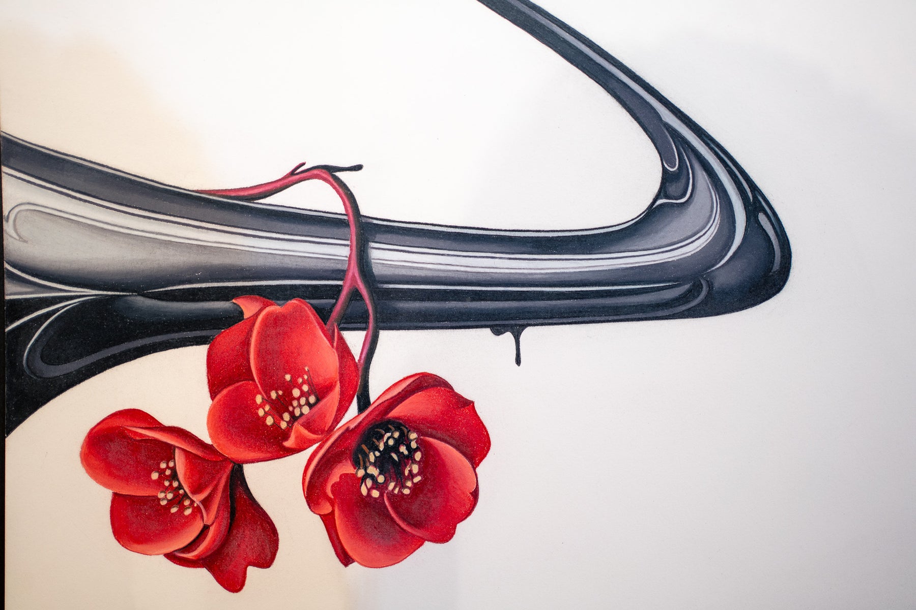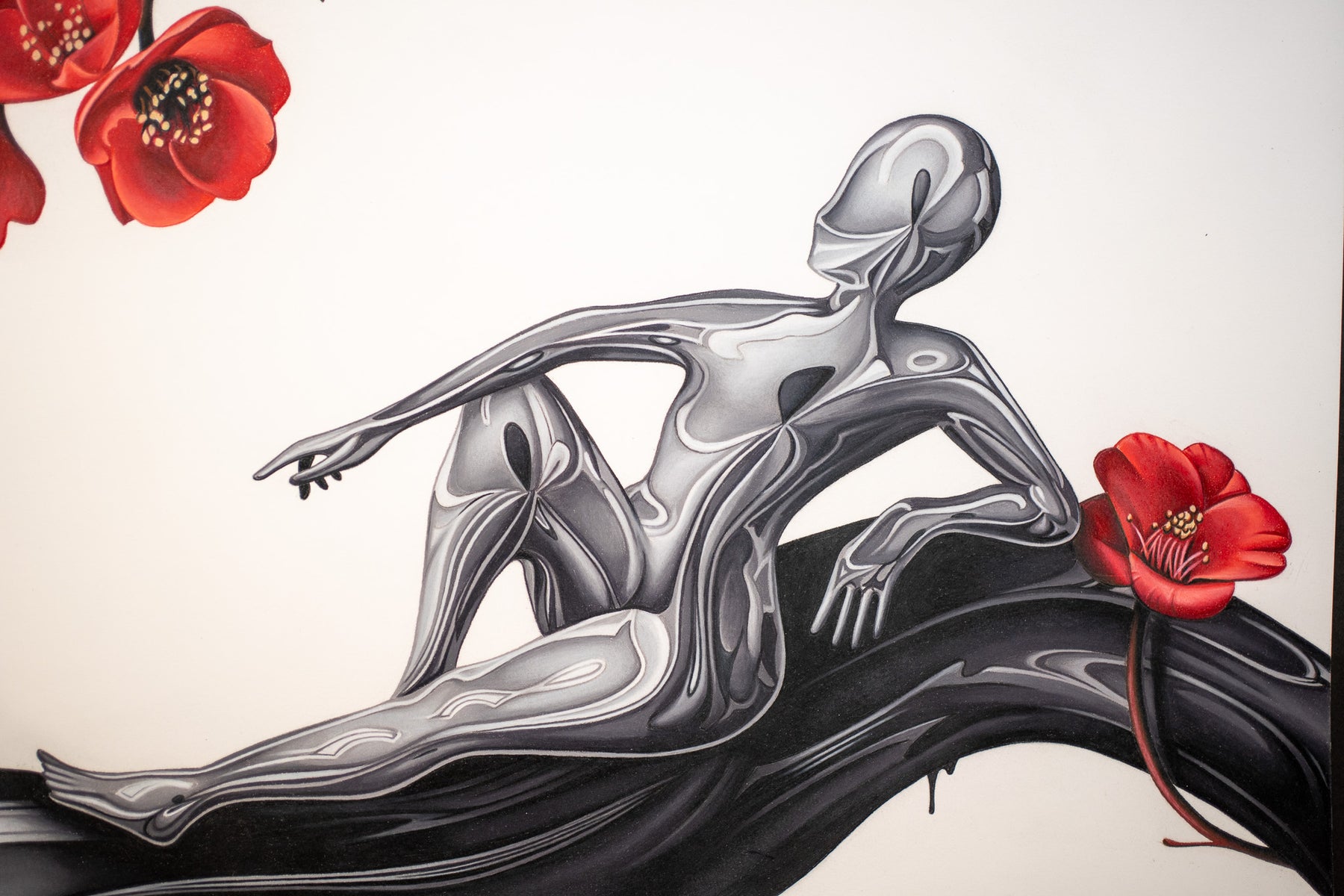 Tanner Valant creates hyper-realistic, unexpected image pairings—fish swim around M.C. Escher-like spheres, paint-dripping hands hold bonsais, and classical busts are drenched in mercury-like liquid—challenging viewers to explore themes of balance, duality, and human interaction through dark, mystical elements. At just 19, Valant, an emerging artist at the Art Institute of Chicago, achieves stunning precision using colored pencils, pens, airbrushes, and markers. As his technique evolves, he aims to engage critically with society, incorporating familiar objects to reflect our changing world.