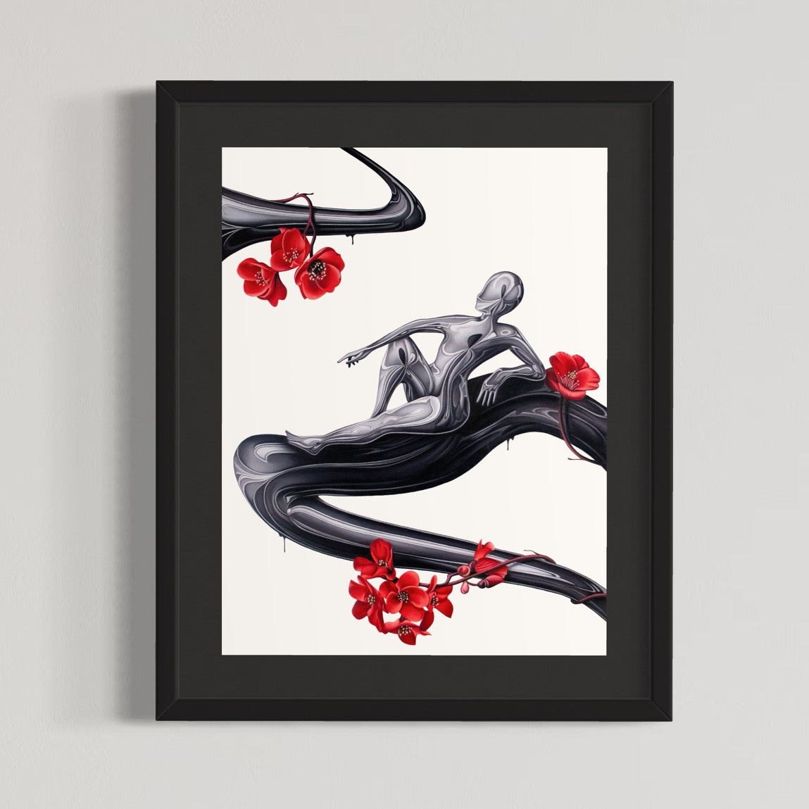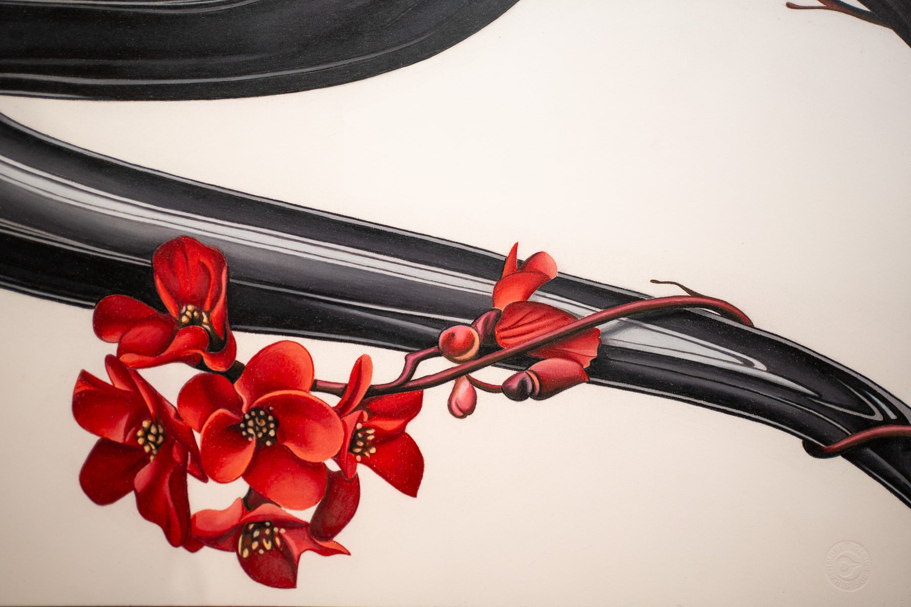 Size: 22"W x 30"H original artwork, framed in a 29"W x 35"H black frame with black matting.