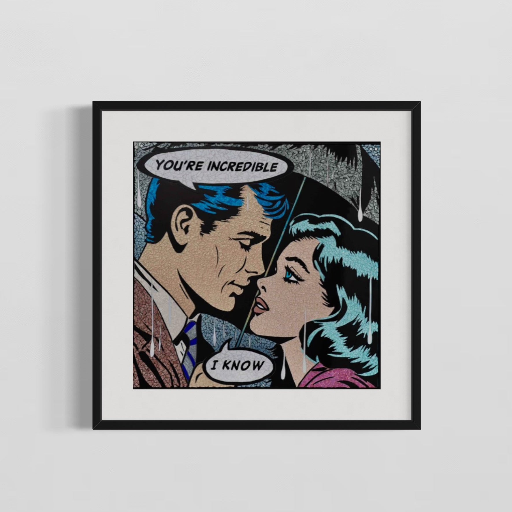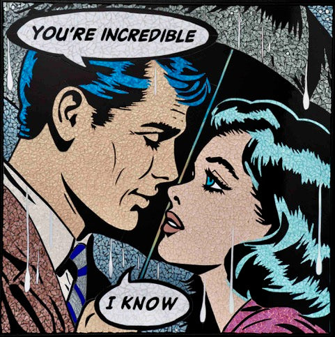 Male and female figure face to face under umbrella in comic book style and text bubbles blue hair highlights and glass mosaic
