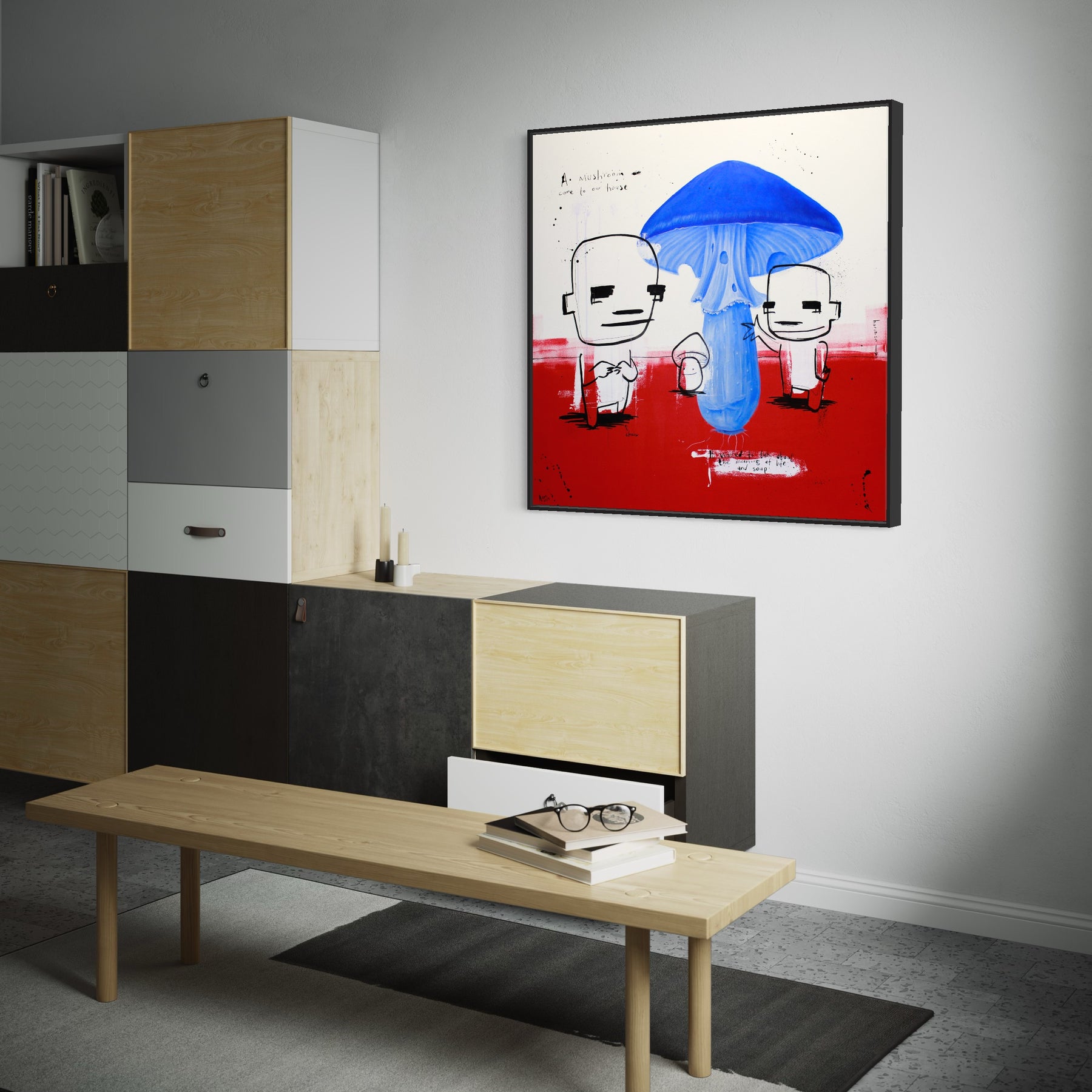Concentrating on universally understood needs and emotions, Dutch artist Jan-Hein Arens is able to connect with every viewer and admirer of his works. Arens brings together humor and alienation through his paintings. The forefront is typically centered on a simplified figure and text that almost appears to be the thoughts of the figure. Often realistic drawings of body parts, common everyday objects or products are superimposed onto the foreground. Each piece is augmented with additional handwritten text detailing certain aspects of the piece in a comical tone. Paint splatters and rough brushstrokes fill out the remaining space in the paintings, allowing the figures and text to be the focus of each well-thought-out illustration.