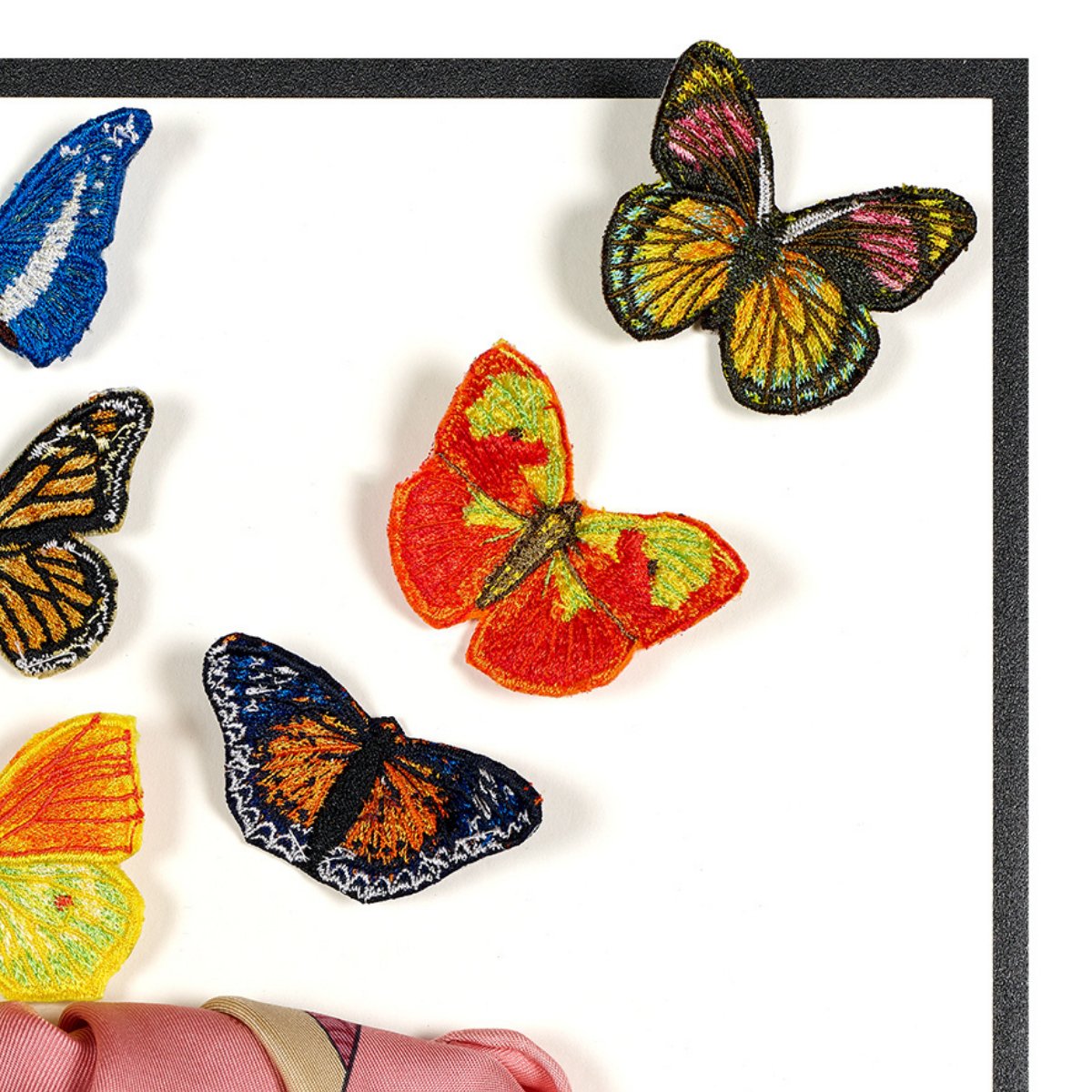 For the Butterfly Surprise pieces, Stephen wanted to recreate a shopping bag out of his up-cycled luxury pieces. The piece starts with a luxury bag that is deconstructed, embroidered and then reconstructed back into a bag shape. Luxury scarf remnants are then draped and mounted so they appear to be flowing out of the bag. Embroidered butterflies are then dimensionally mounted to appear exploding out of the bag.