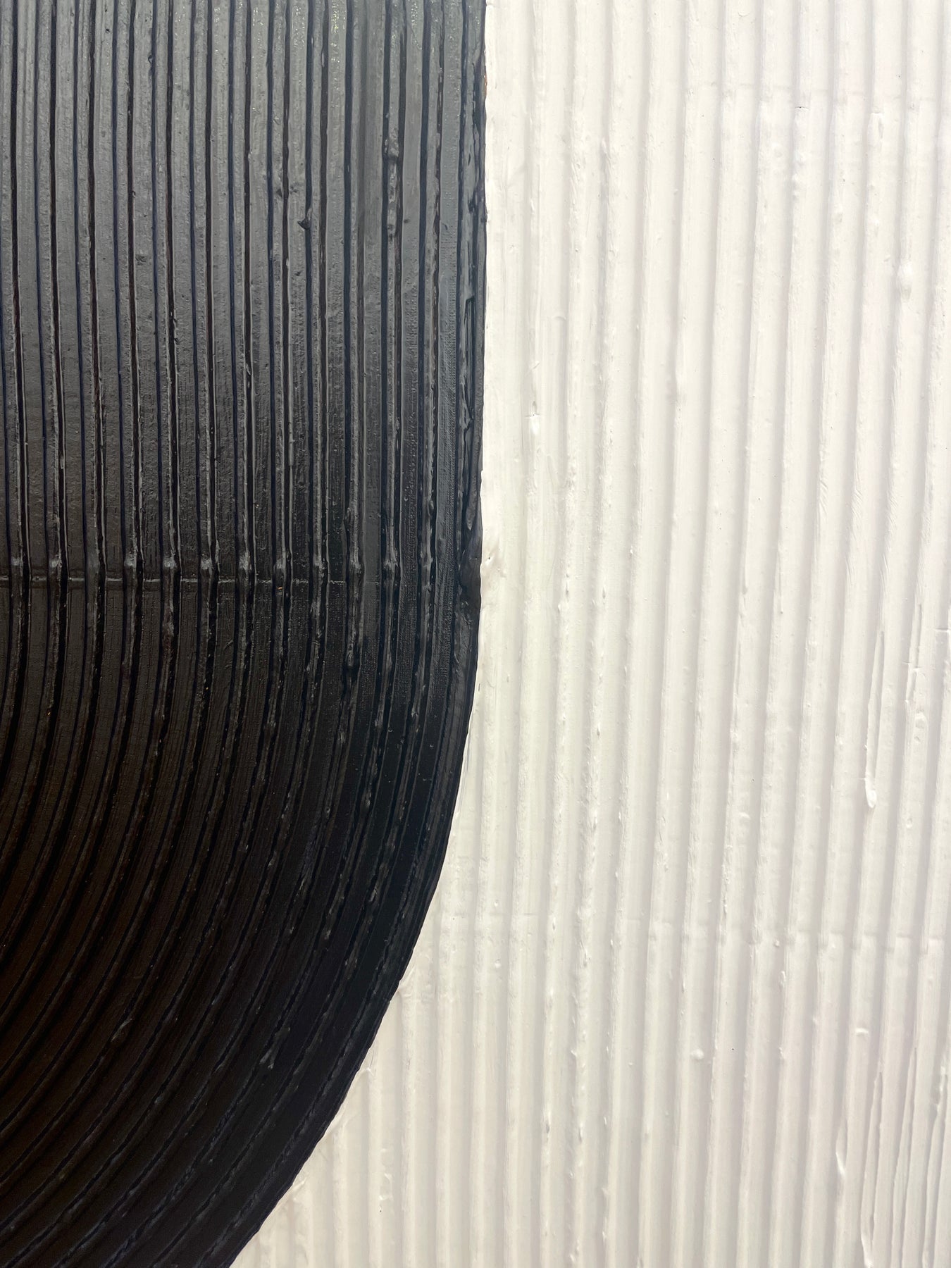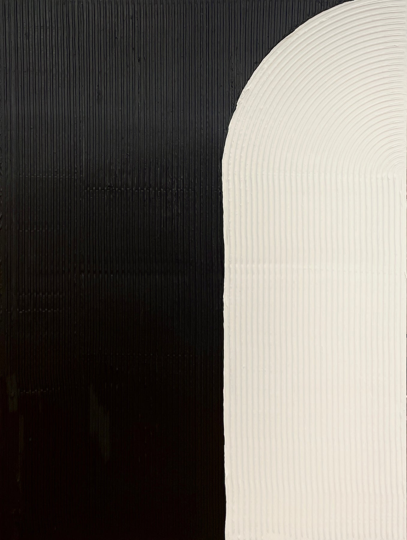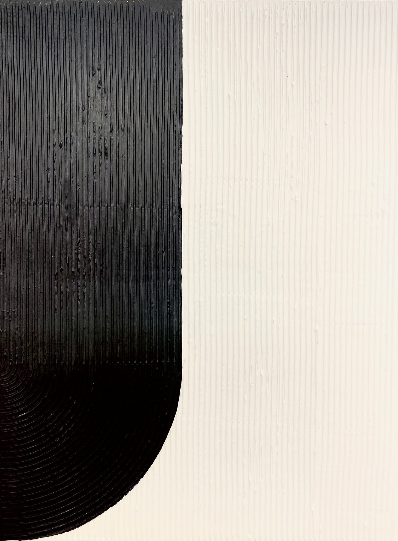 Jerilee, a Philadelphia-based artist working under the name ‘Lee in Cerulean’, creates striking minimalist pieces. For Lee, simple curves, asymmetry, and overlapping forms reflect the beautiful world around us—and find, within our surroundings, the continuity, serendipity, and at times mundane nature of everyday life. Deriving from the Japanese Wabi-Sabi philosophy’s embrace of imperfection, highly textural pieces show Lee’s freeform strokes, using a blend of joint compound, acrylic paint, and a myriad of other media. Under this philosophical orientation, ridges and built-up materials are a reminder that we continue to evolve, just as nature does.