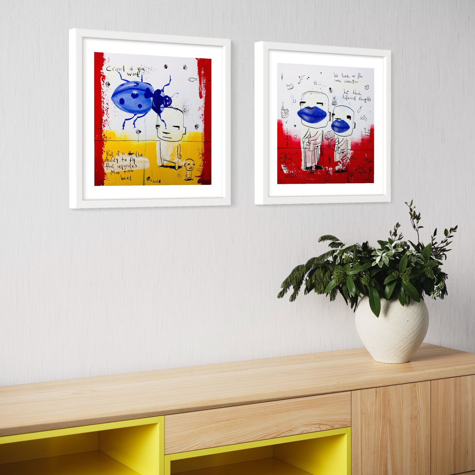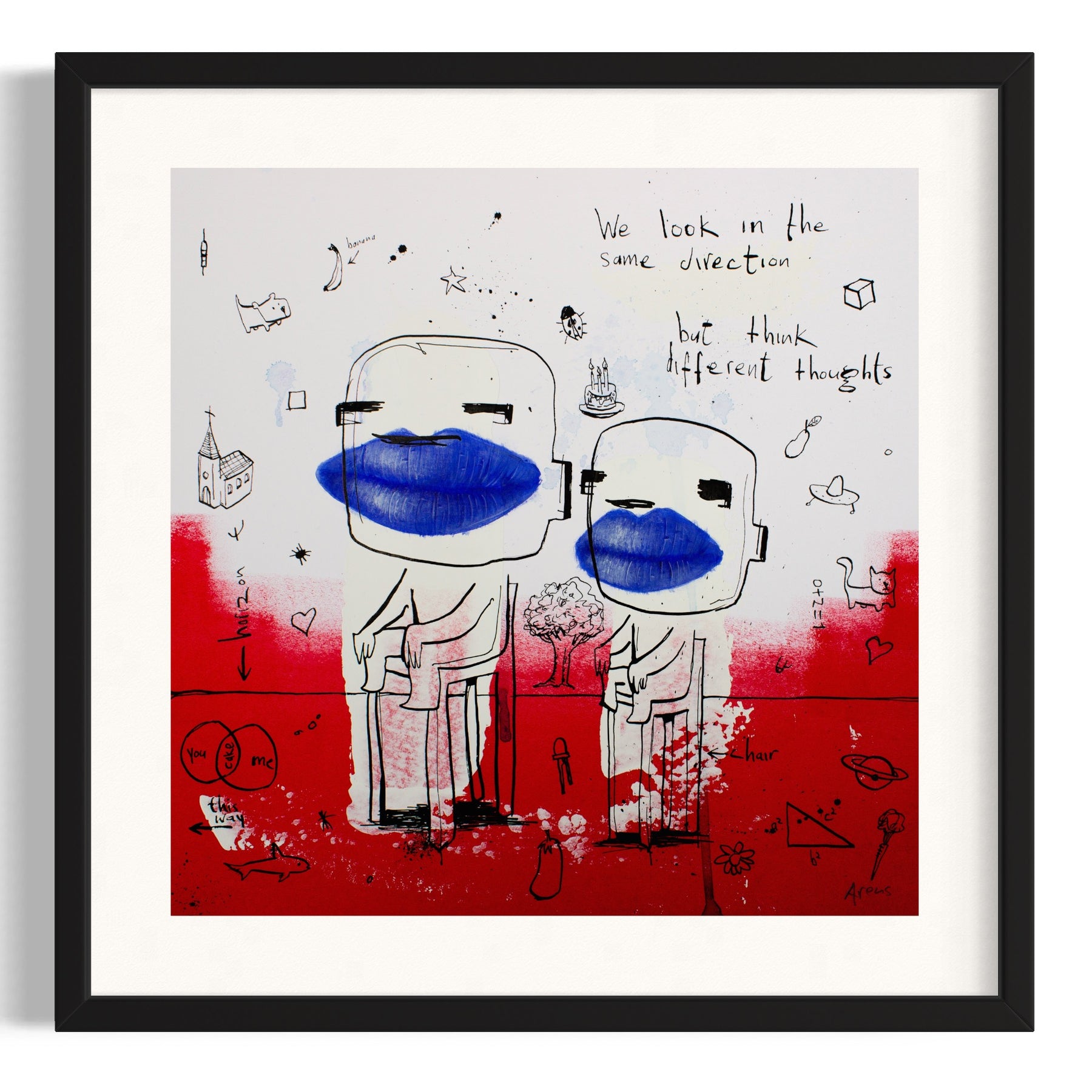Concentrating on universally understood needs and emotions, Dutch artist Jan-Hein Arens is able to connect with every viewer and admirer of his works. Arens brings together humor and alienation through his paintings. The forefront is typically centered on a simplified figure and text that almost appears to be the thoughts of the figure. Often realistic drawings of body parts, common everyday objects or products are superimposed onto the foreground. Each piece is augmented with additional handwritten text detailing certain aspects of the piece in a comical tone. Paint splatters and rough brushstrokes fill out the remaining space in the paintings, allowing the figures and text to be the focus of each well-thought-out illustration.
