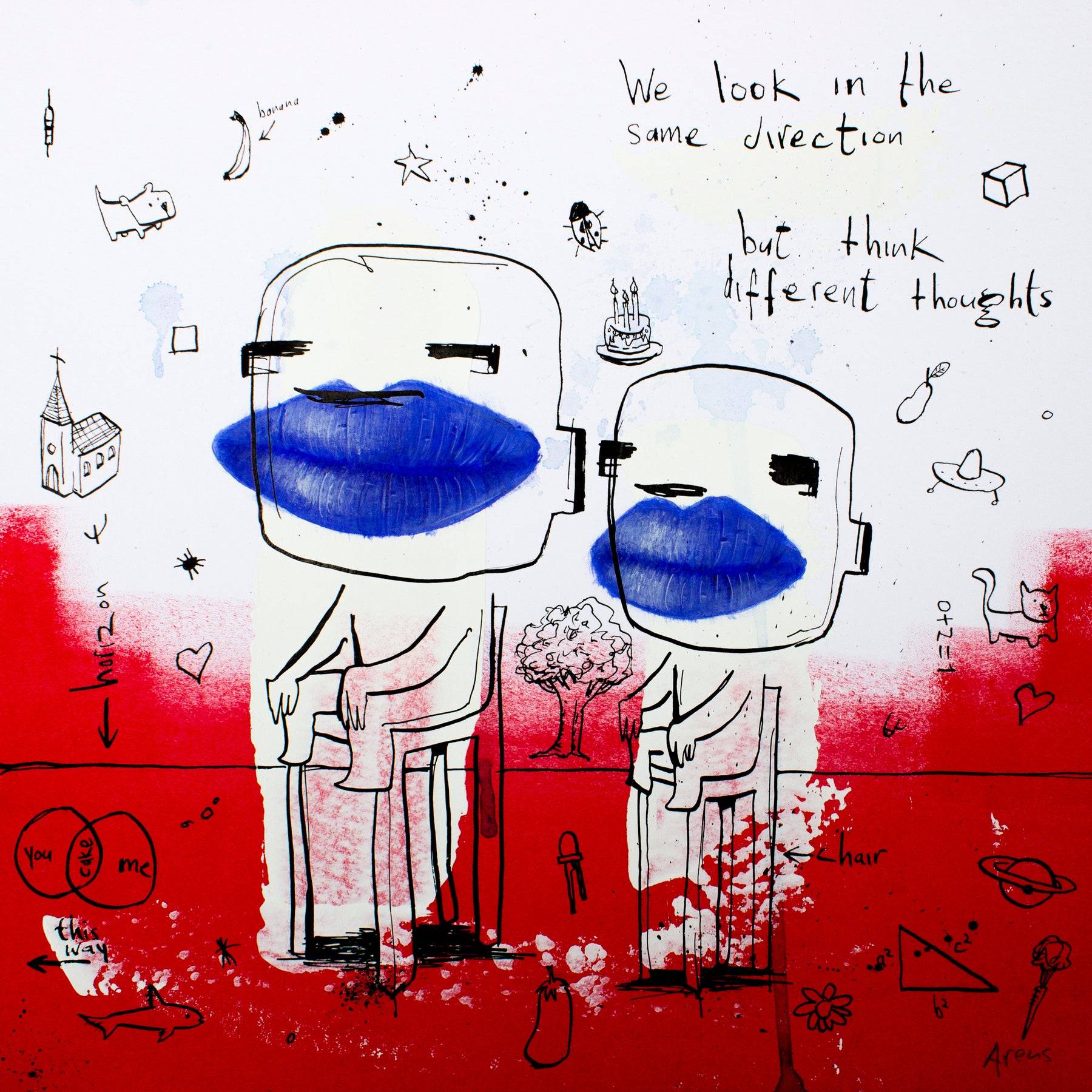 two doodled sketchy characters sitting next to each other, both looking in the same direction with small doodles all over composition, with handwritten text on red and white background