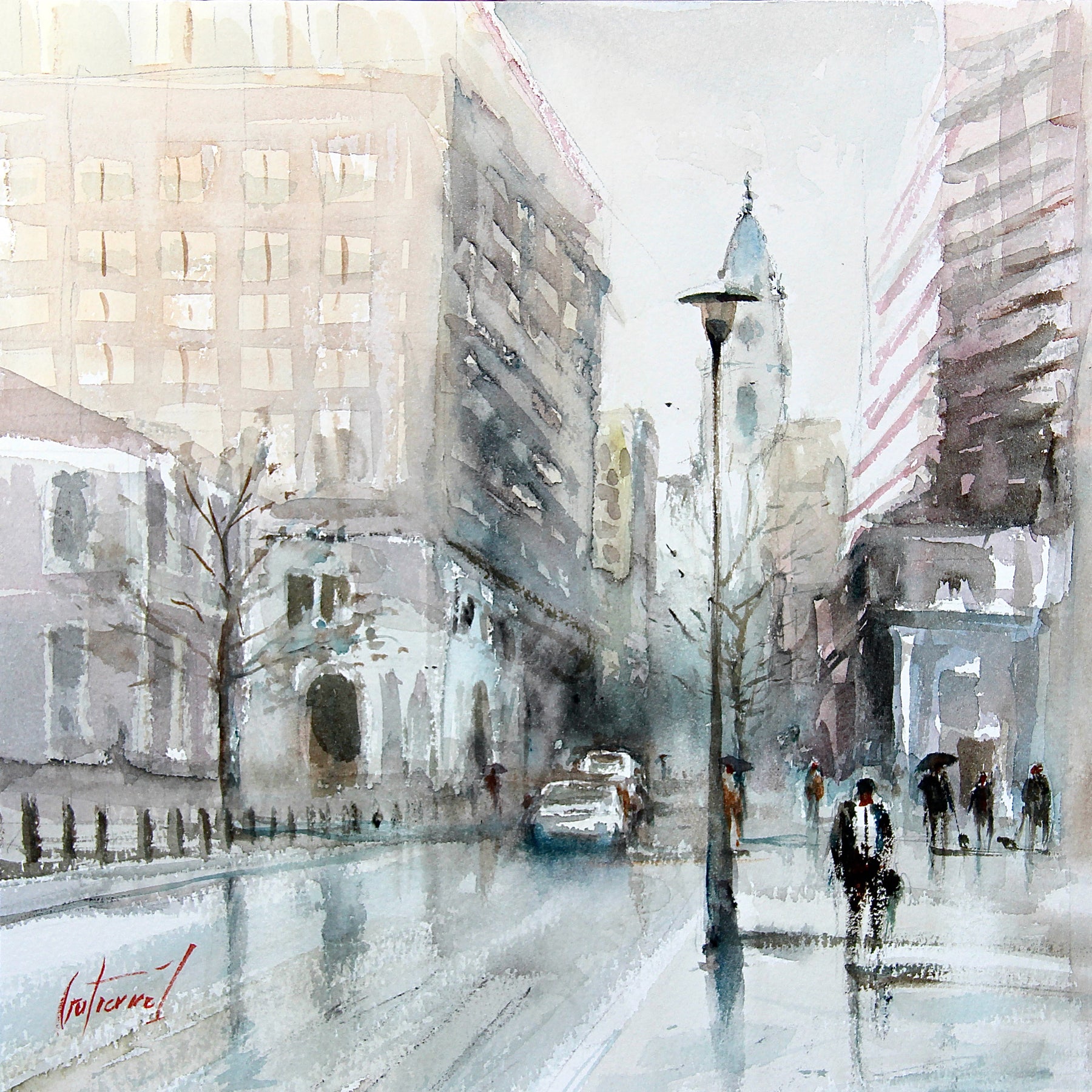 Water color in light grey washes and blues of sky scraper buildings in Philadelphia, people with umbrellas, street lamp and rain