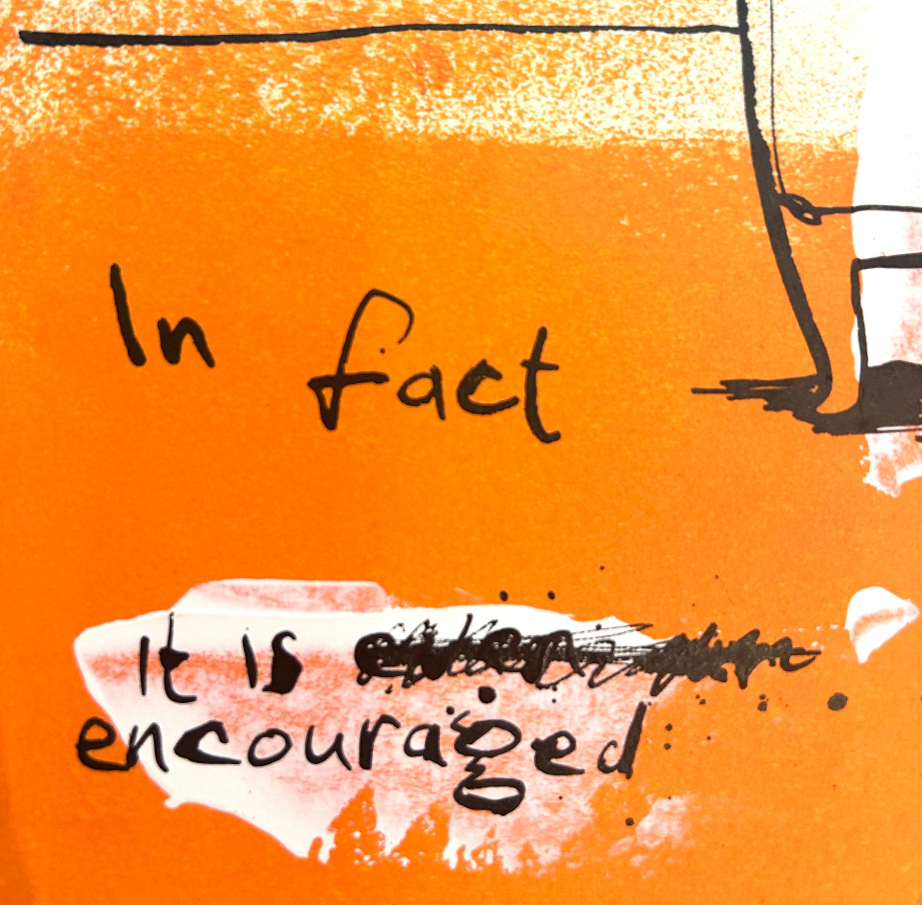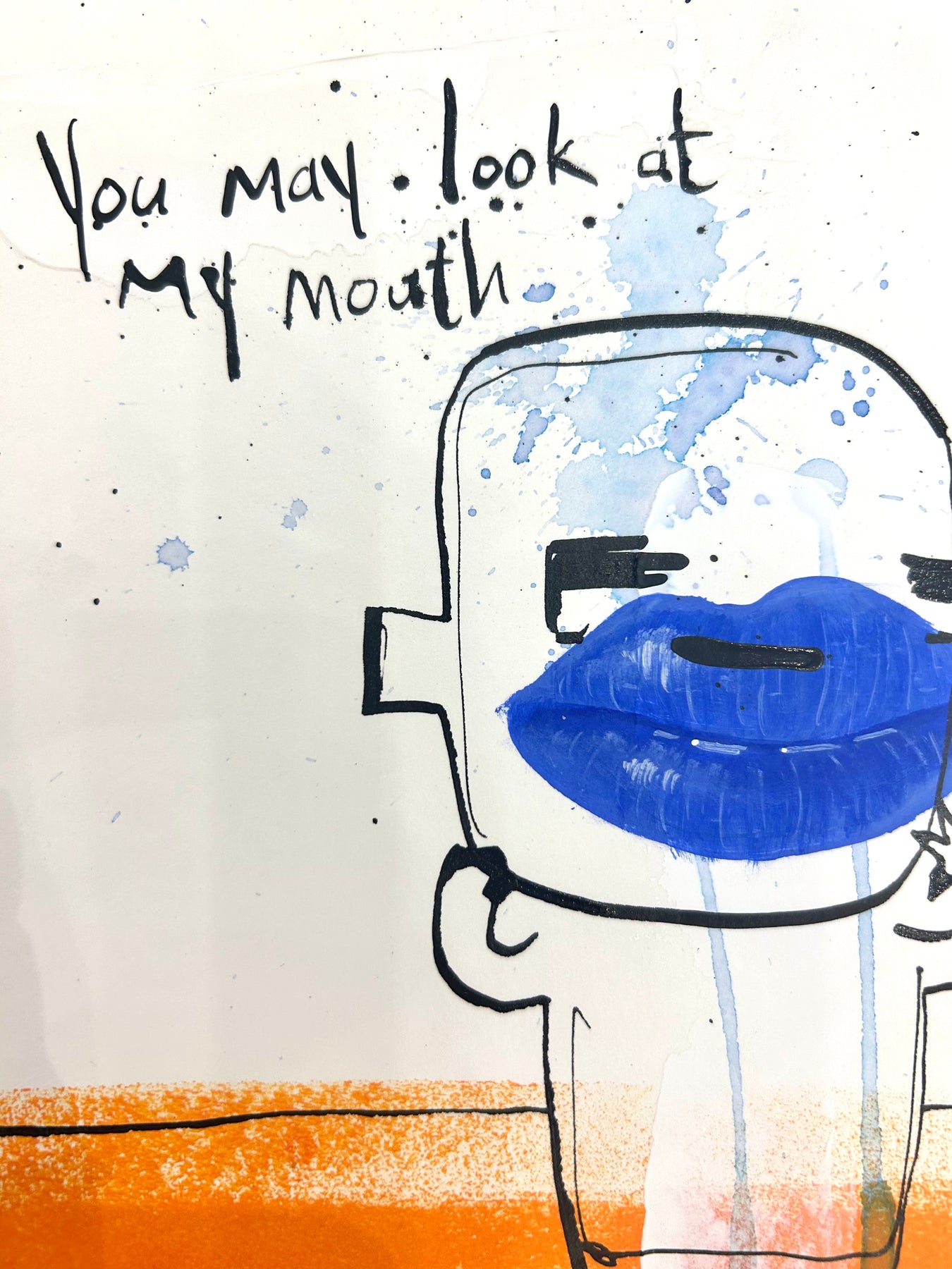 One standing figure with blue lips and one figure seated in front of a white and orange background with writing.