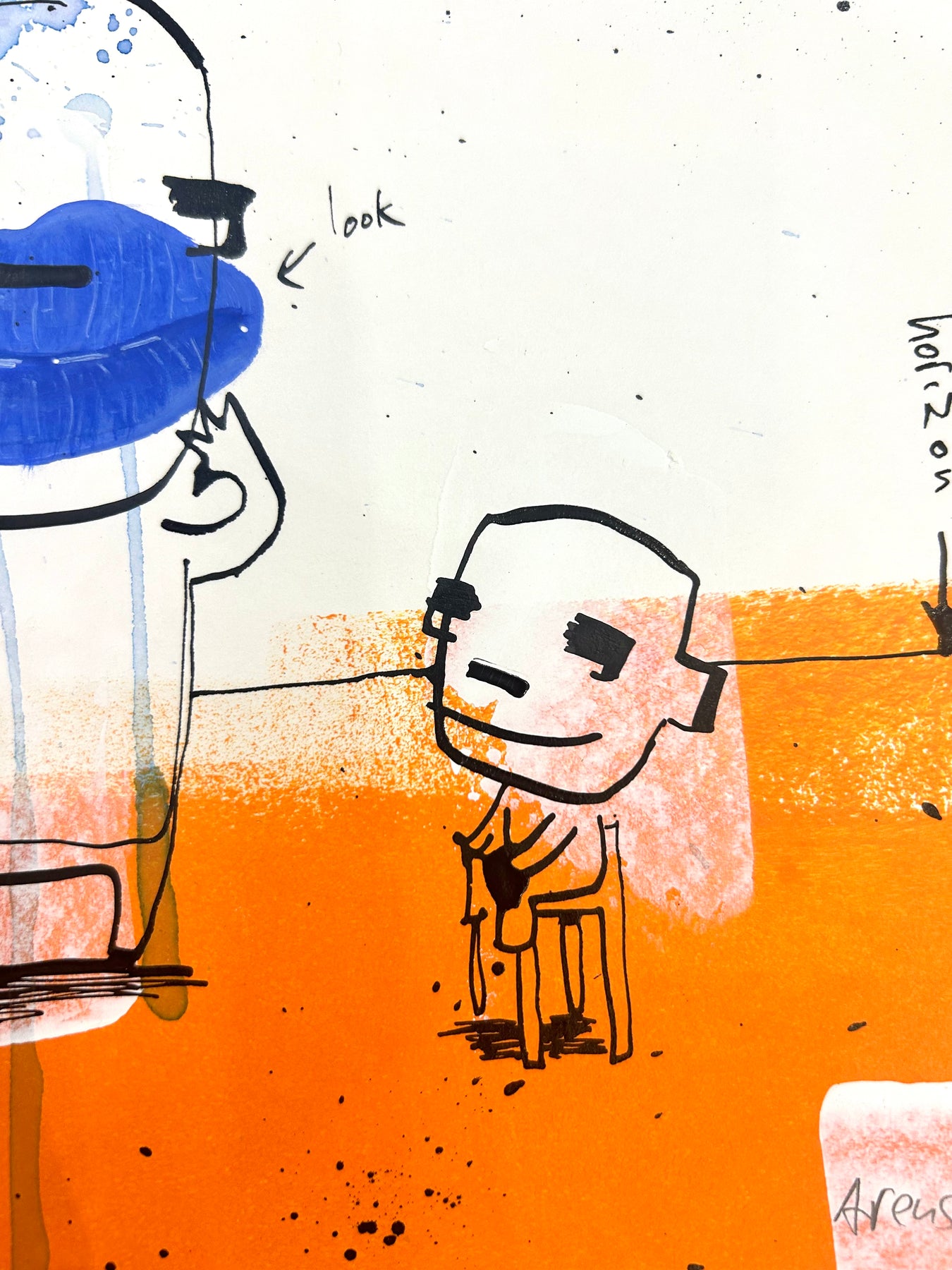 Concentrating on universally understood needs and emotions, Dutch artist Jan-Hein Arens is able to connect with every viewer and admirer of his works. Arens brings together humor and alienation through his paintings. The forefront is typically centered on a simplified figure and text that almost appears to be the thoughts of the figure. Often realistic drawings of body parts, common everyday objects or products are superimposed onto the foreground. Each piece is augmented with additional handwritten text detailing certain aspects of the piece in a comical tone. Paint splatters and rough brushstrokes fill out the remaining space in the paintings, allowing the figures and text to be the focus of each well-thought-out illustration.