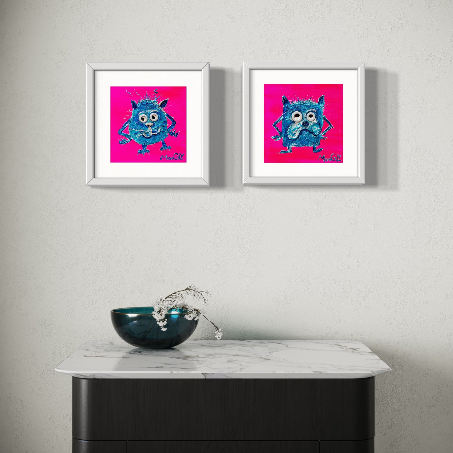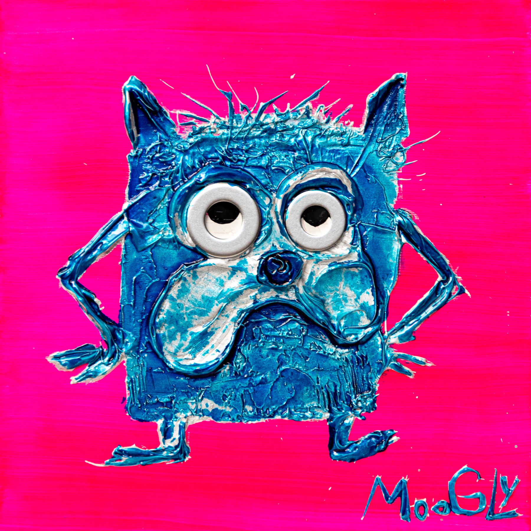 blue creature dog snout looking angry in resin and acrylic on pink background