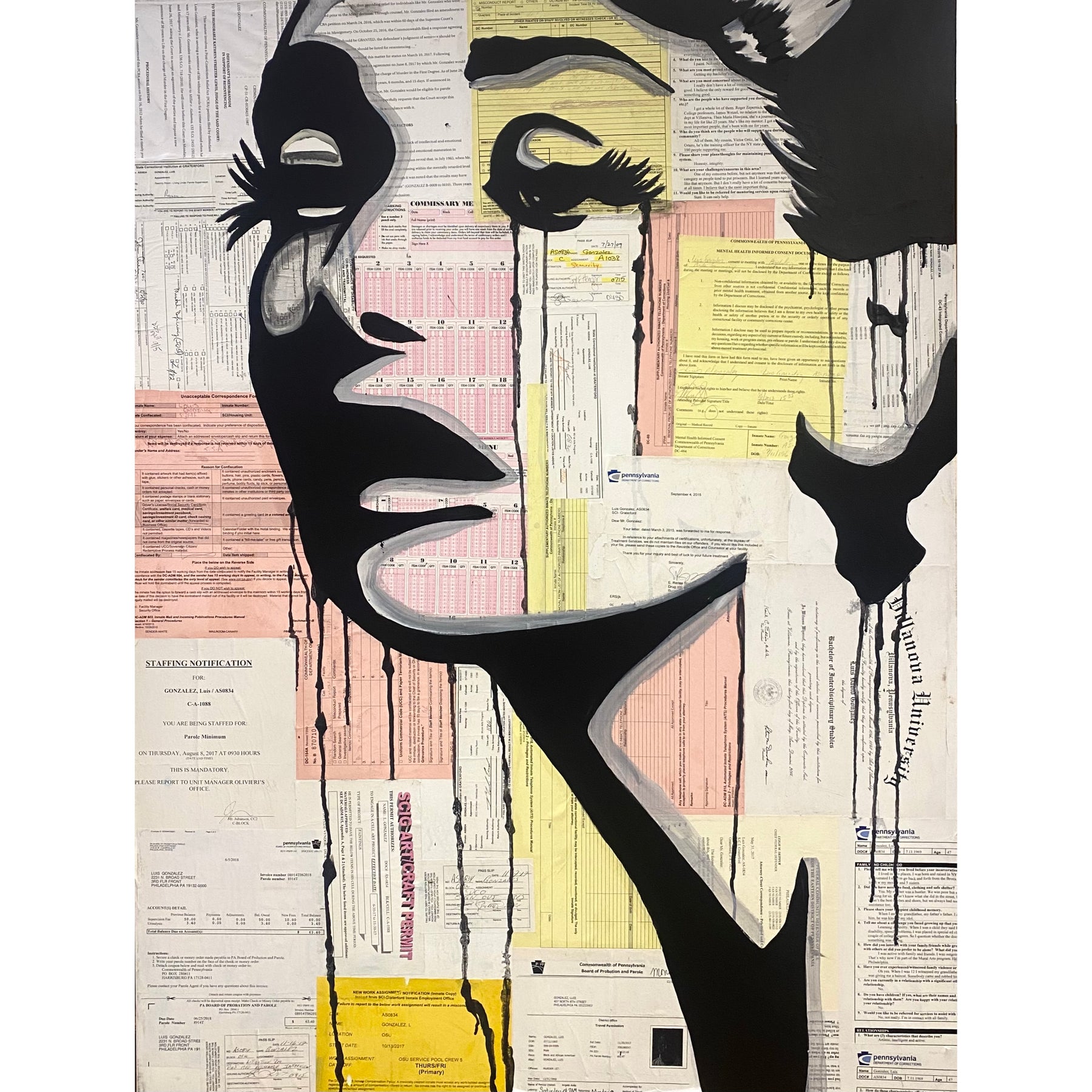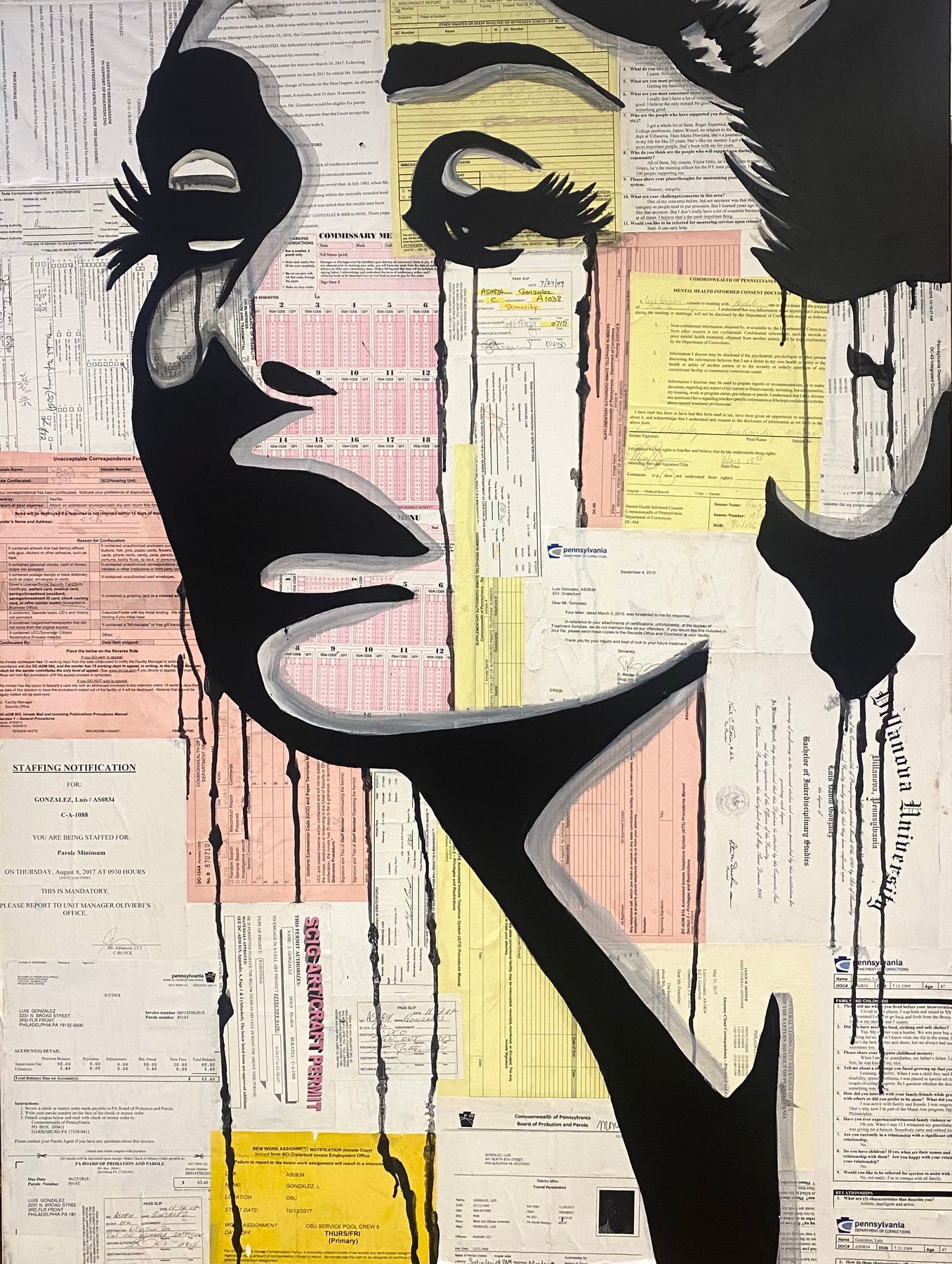 “Mama I Made It is a dedication to my mother who always believed that one day I would make it home.”  Unfortunately, Suave was released in 2017, but his mother passed in 2009.  Maria Gonzalez visited her son every week for 24 years. What the viewer sees behind the face of the artist’s mother is the official and actual paperwork that is required to process an official release from prison – mental health evaluations, judge orders, security passes, the artist’s college degree, legal mail from the artist’s lawyer, court testimonies, and staffing notifications.