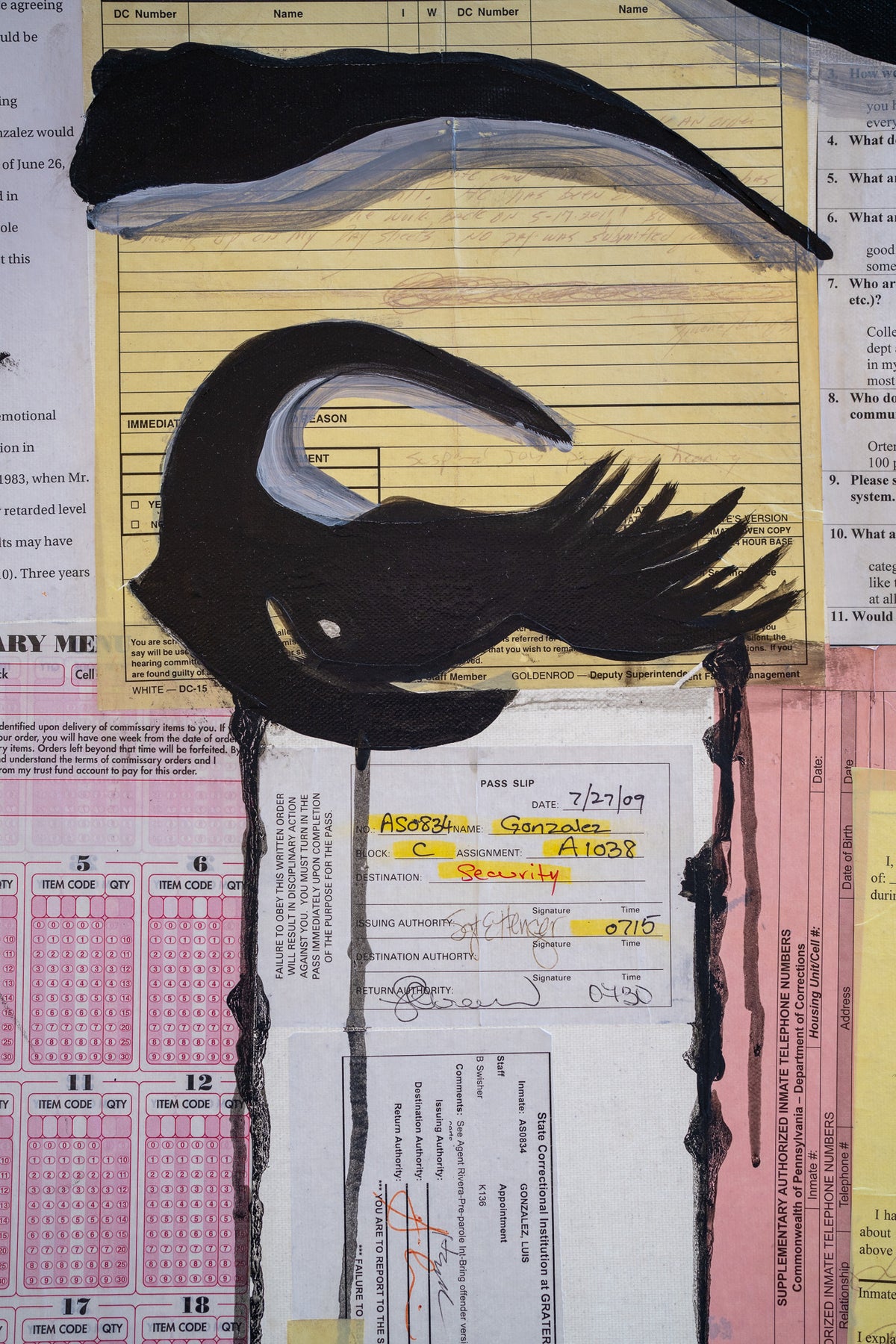 • Acrylic and official Department of Corrections documents from the artist’s prison experience