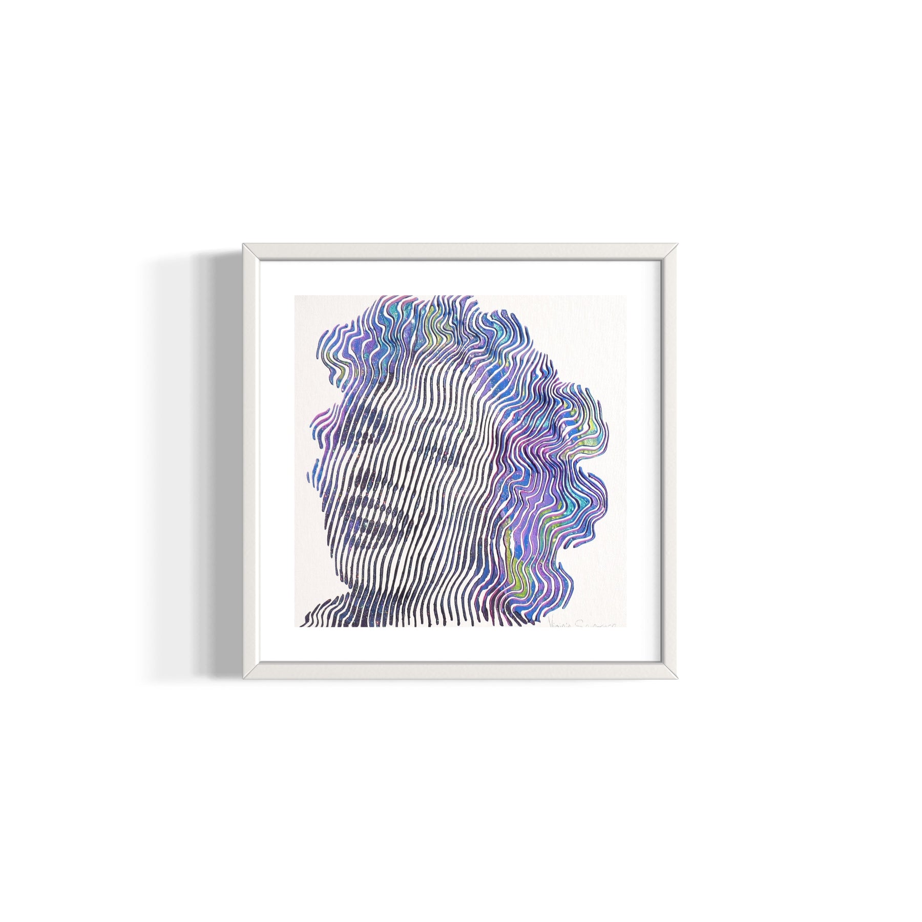 Marilyn Monroe smiling portrait figurative woman in blue green and purple vertical and squiggly lines on white background