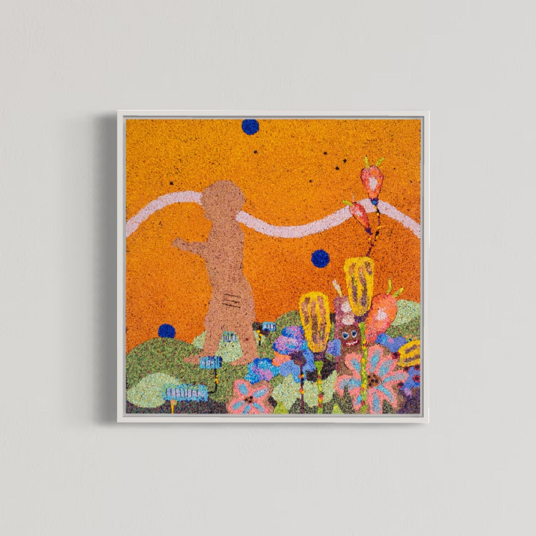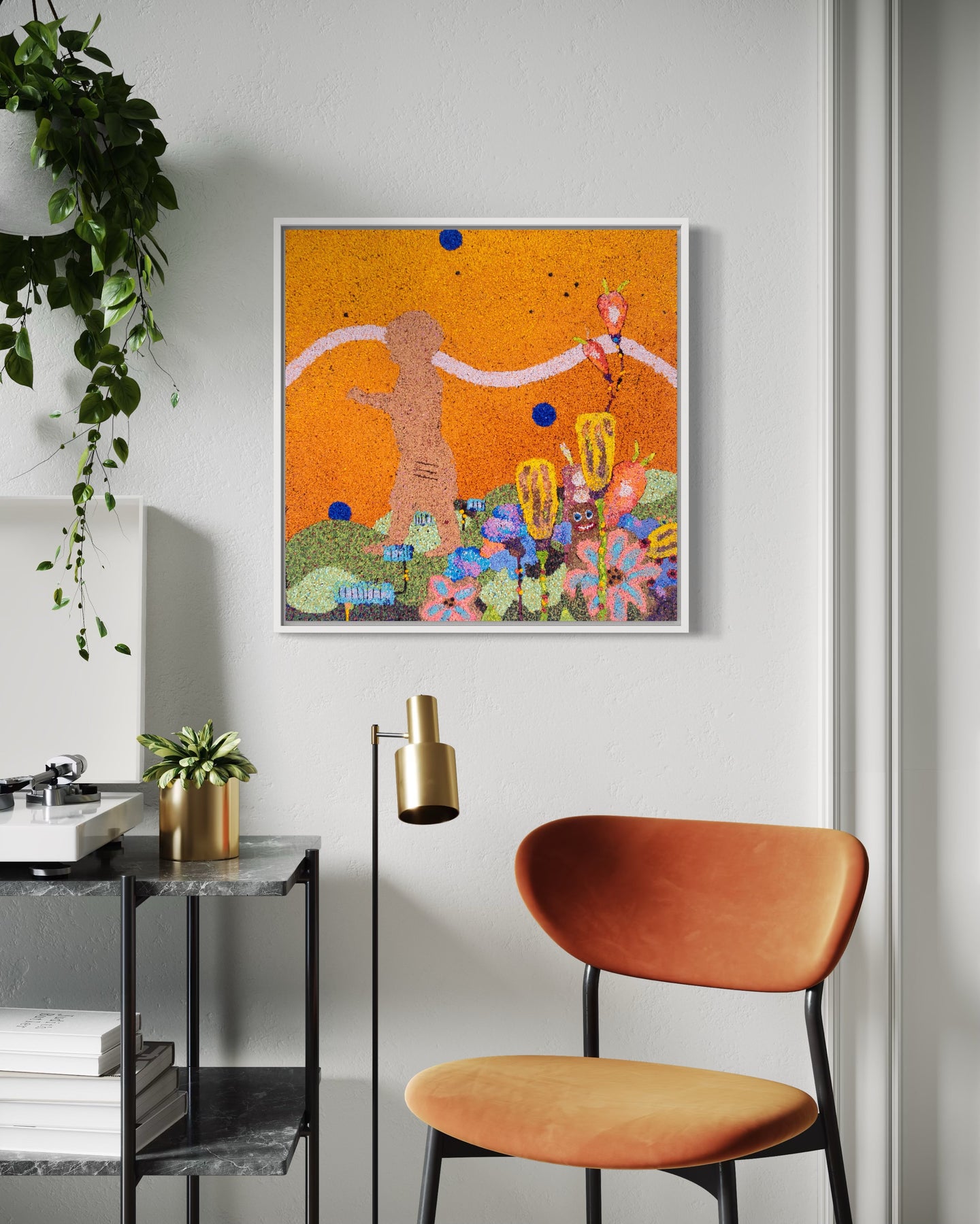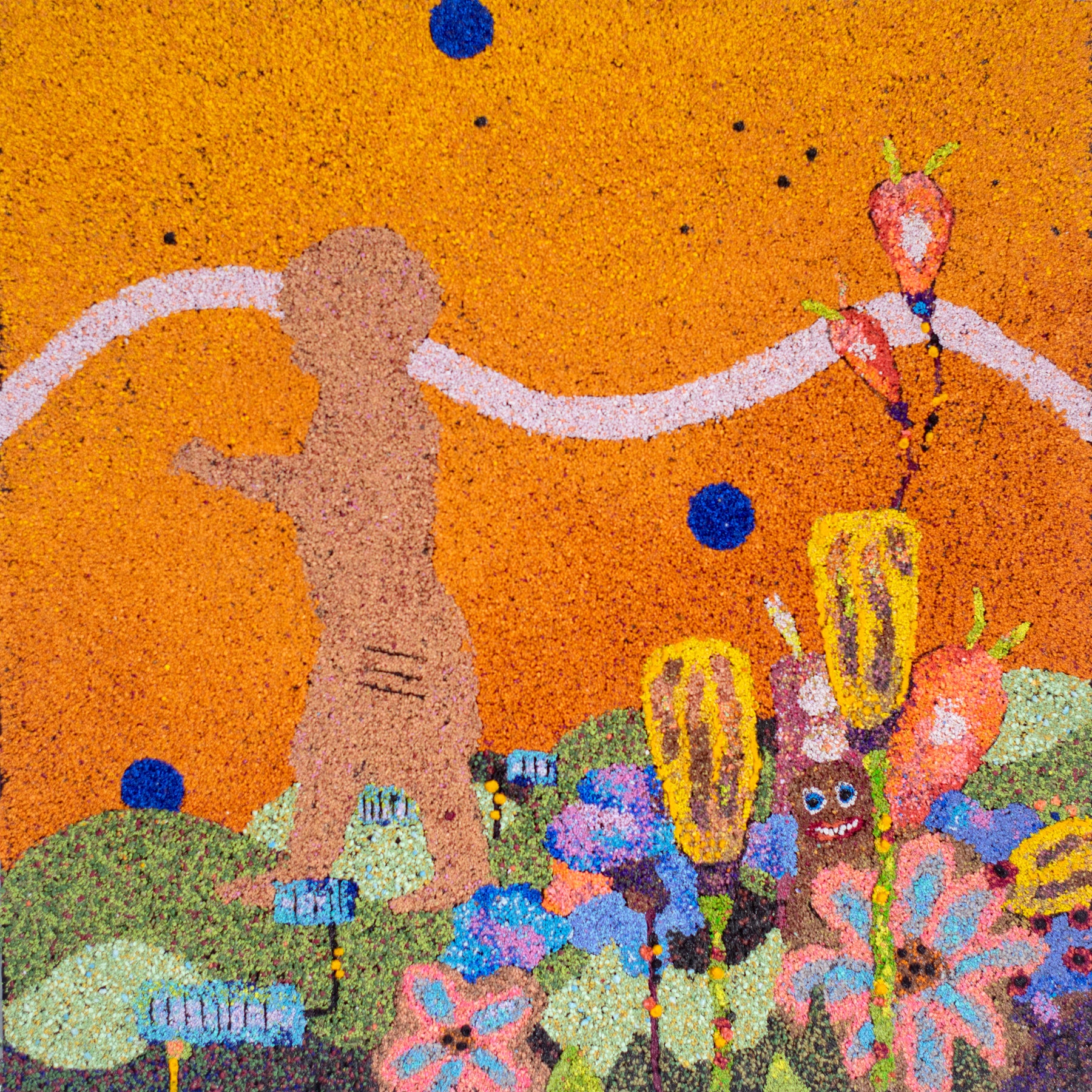 20"x20" abstract piece using crushed volcanic rock and acrylic paint with a child's silhouette and abstract forms over an orange background.