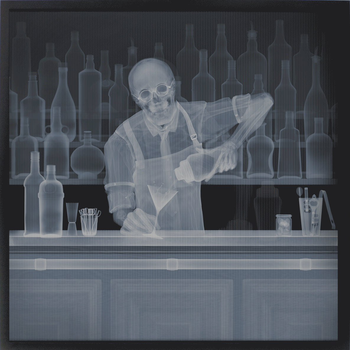 bartender skeleton xray puring and shaking drink cocktail in front of bar with glasses and bottles