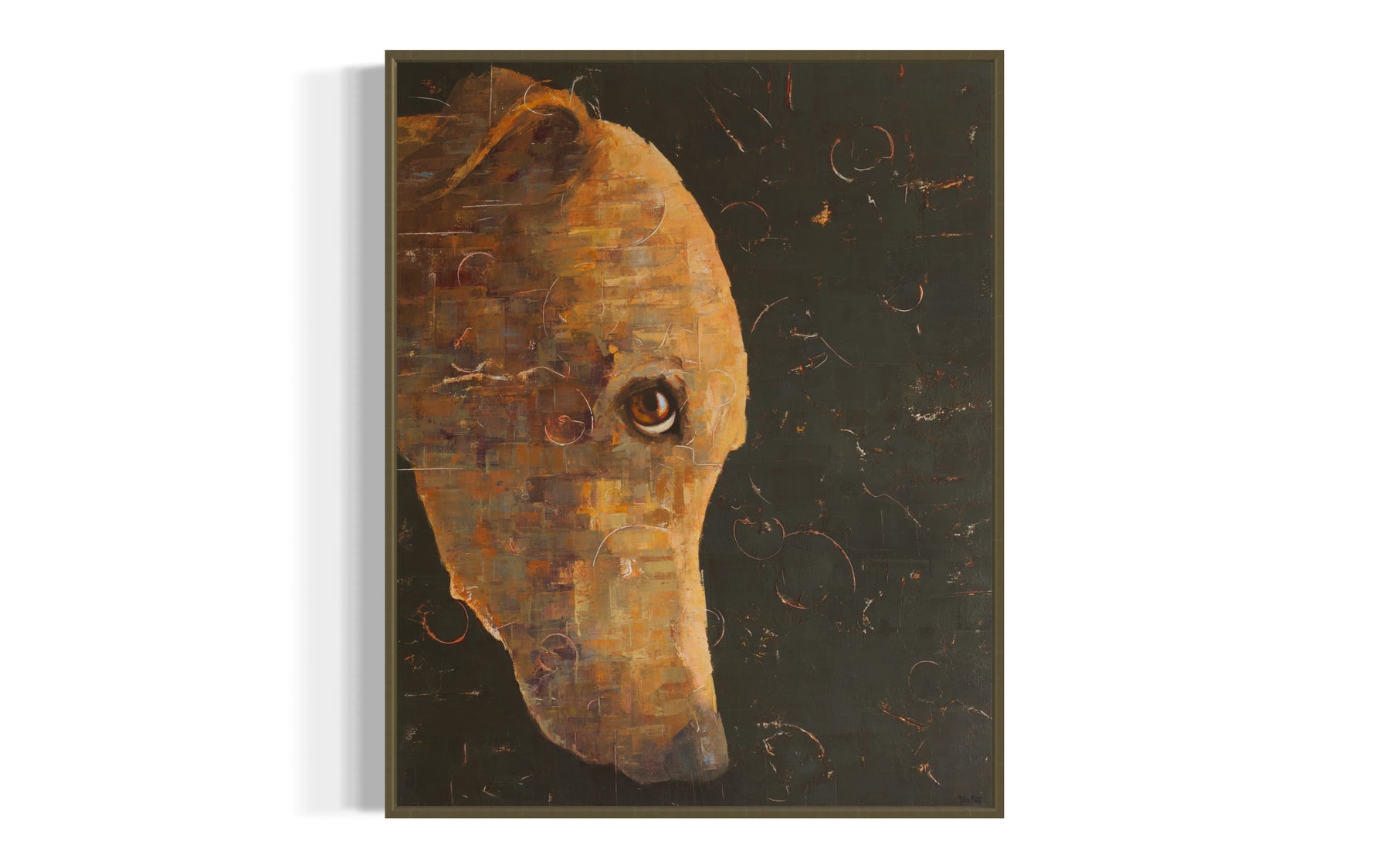 Shy Dog, 32 x 40" oil and acrylic painting on linen by Tomasa Martin. Painting of a golden dog looking at the viewer, on a charcoal gray background.