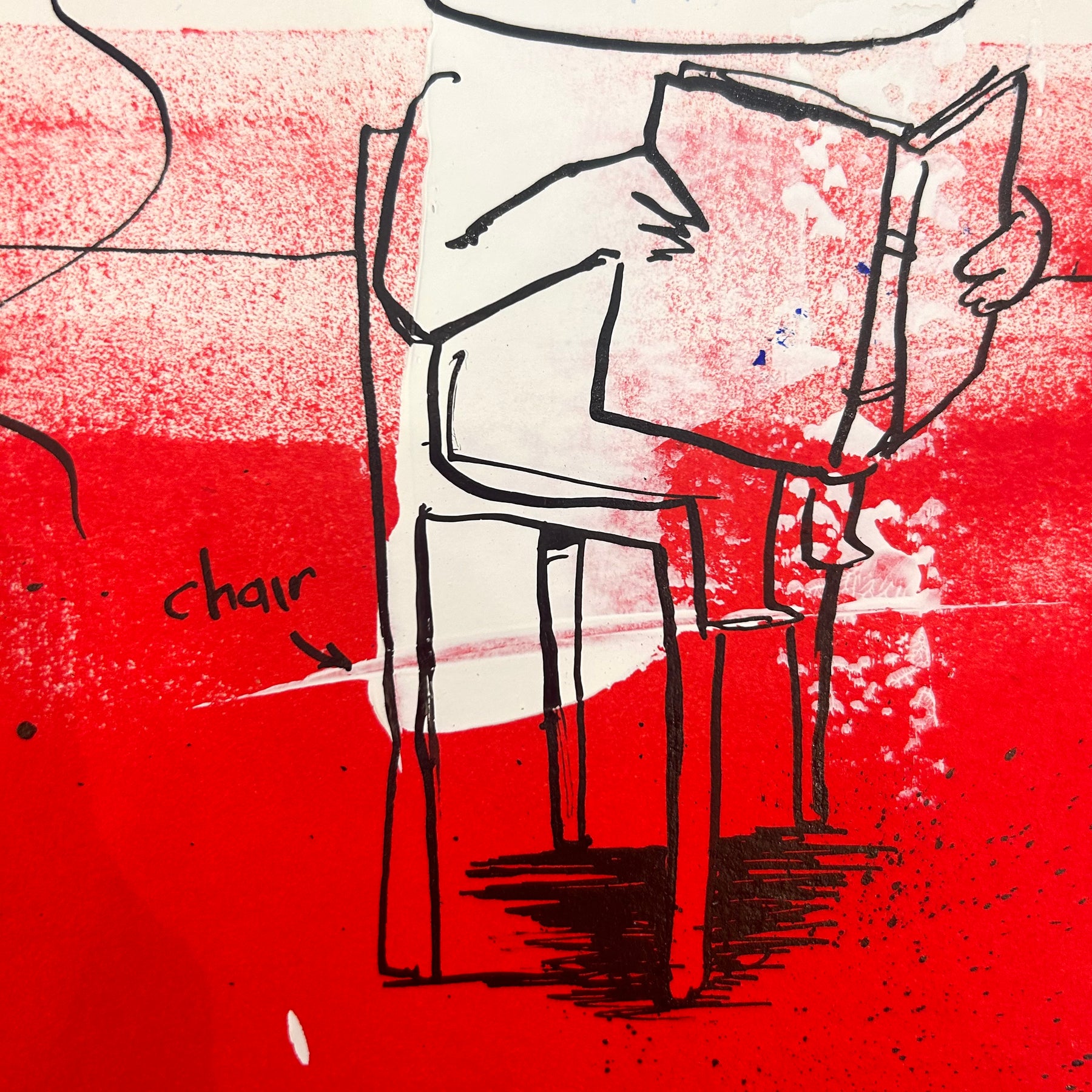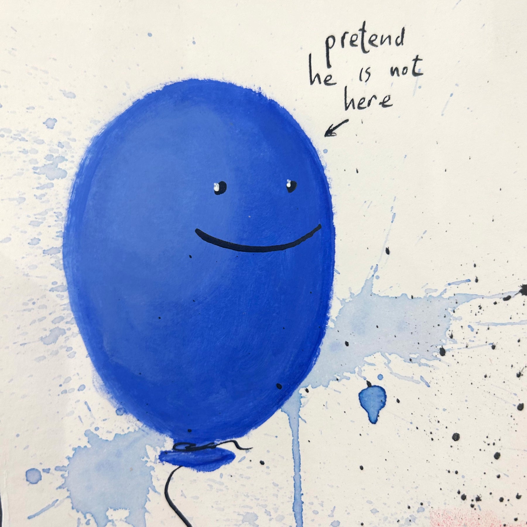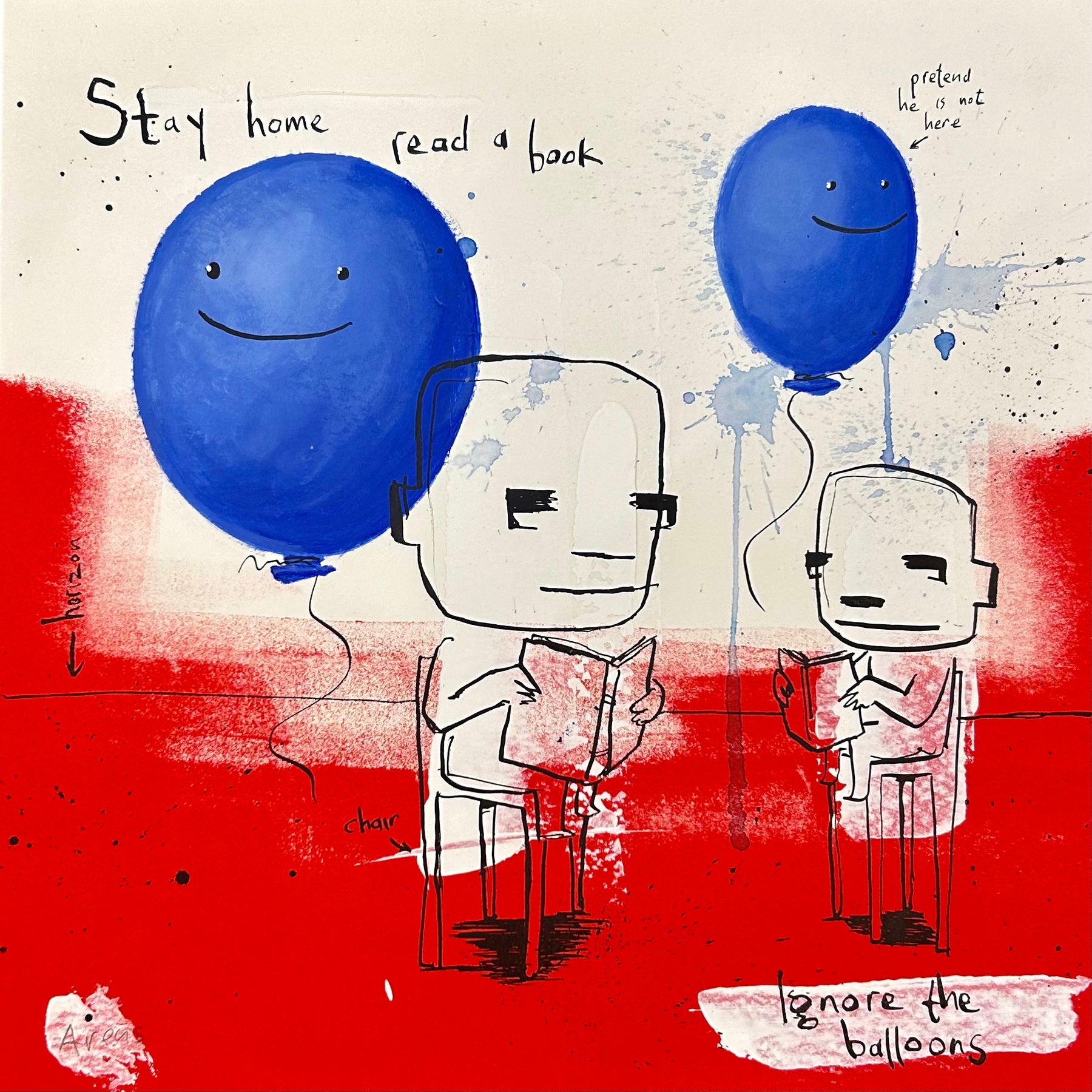 Concentrating on universally understood needs and emotions, Dutch artist Jan-Hein Arens is able to connect with every viewer and admirer of his works. Arens brings together humor and alienation through his paintings. The forefront is typically centered on a simplified figure and text that almost appears to be the thoughts of the figure. Often realistic drawings of body parts, common everyday objects or products are superimposed onto the foreground. Each piece is augmented with additional handwritten text detailing certain aspects of the piece in a comical tone. Paint splatters and rough brushstrokes fill out the remaining space in the paintings, allowing the figures and text to be the focus of each well-thought-out illustration.