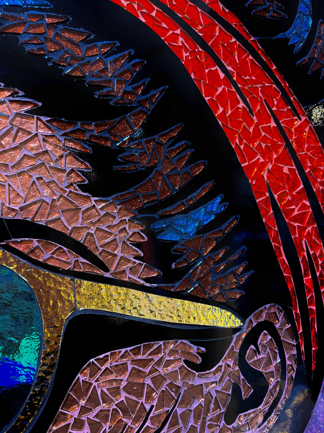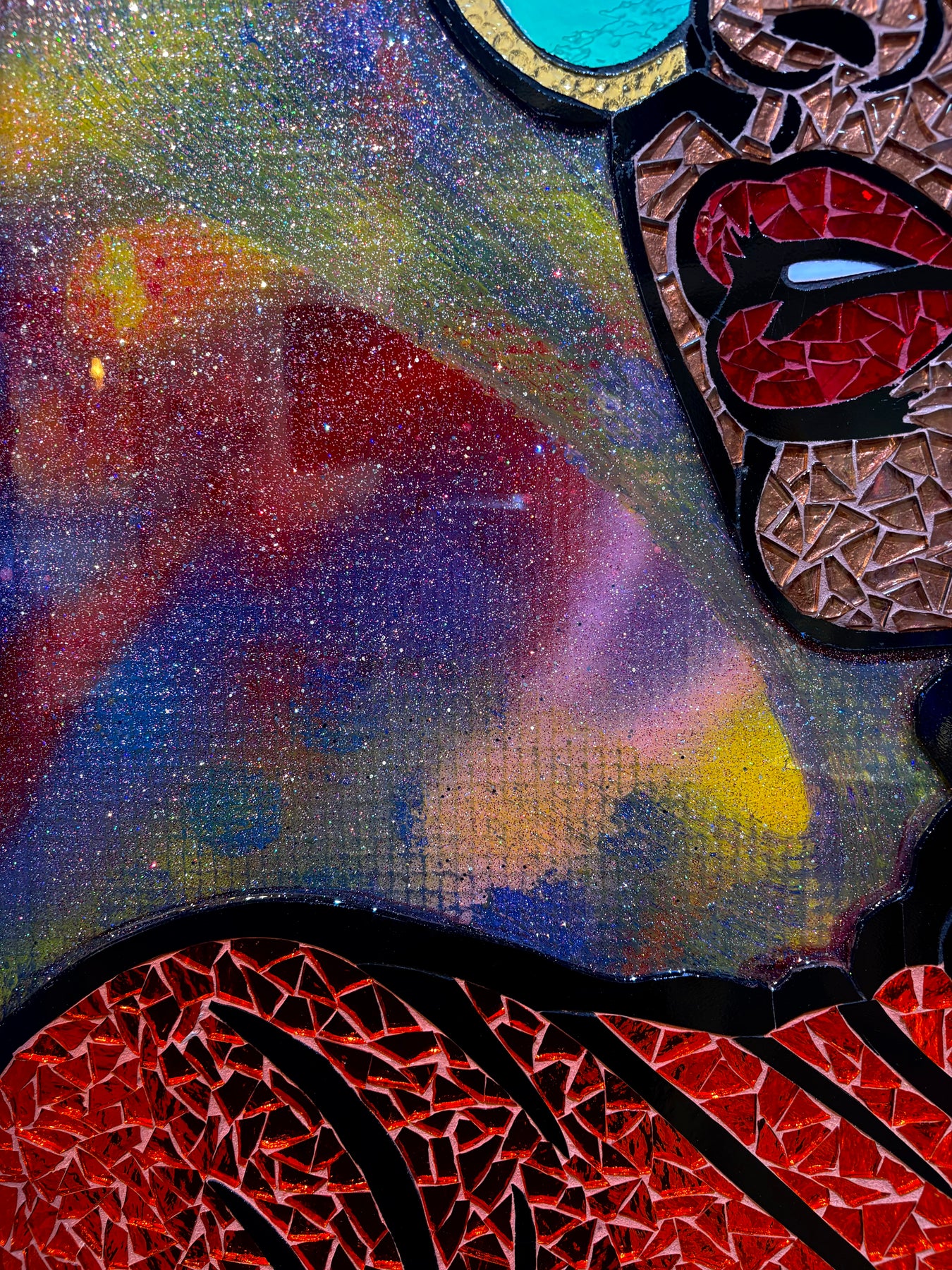 Mosaic made with hand cut stained glass, glitter glass, metallic glass, foil glass and mirrored glass, weldbond glue, hand-dyed grout, acrylic, resin, glitter and neonon Wedi Board.