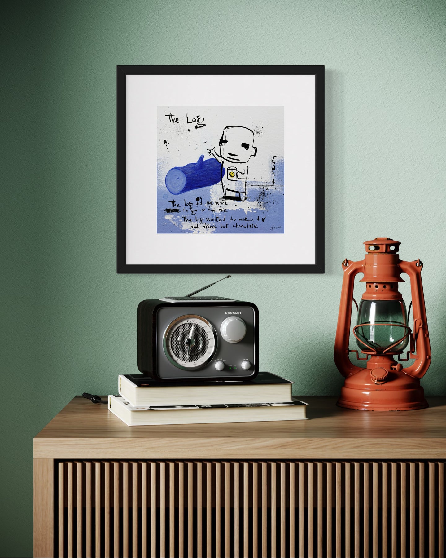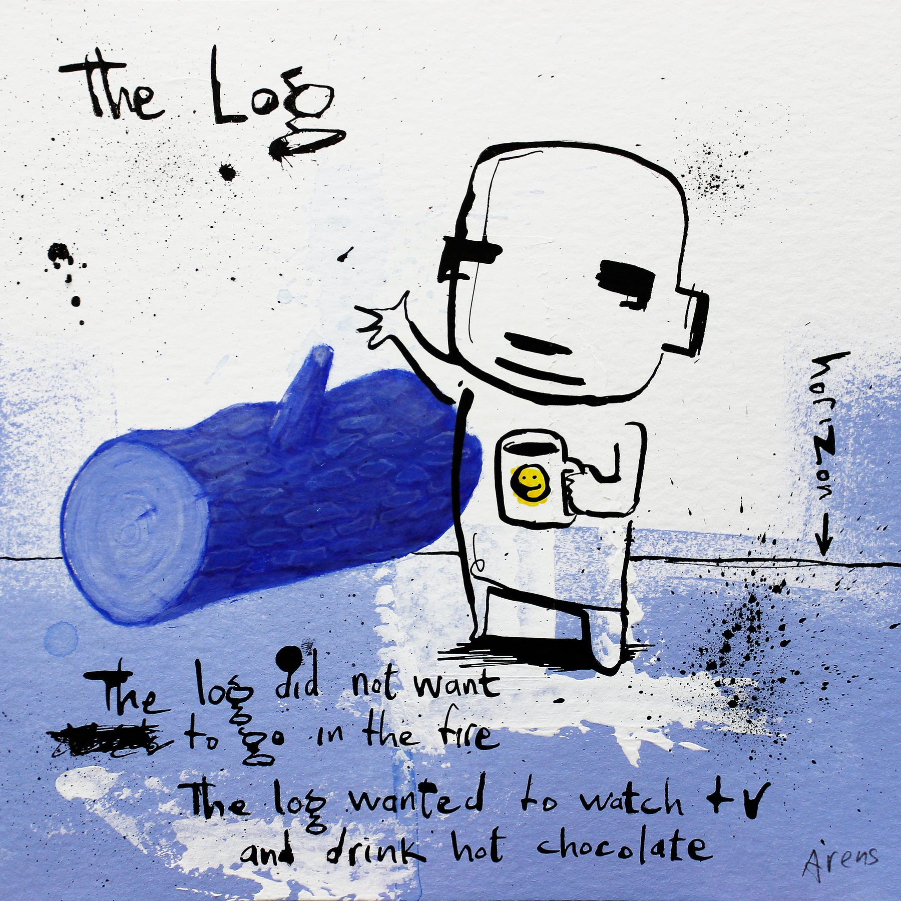 doodle figure holding a mug in black ink on paper with text and drawing of a log with a blue and white background by jan-hein arens
