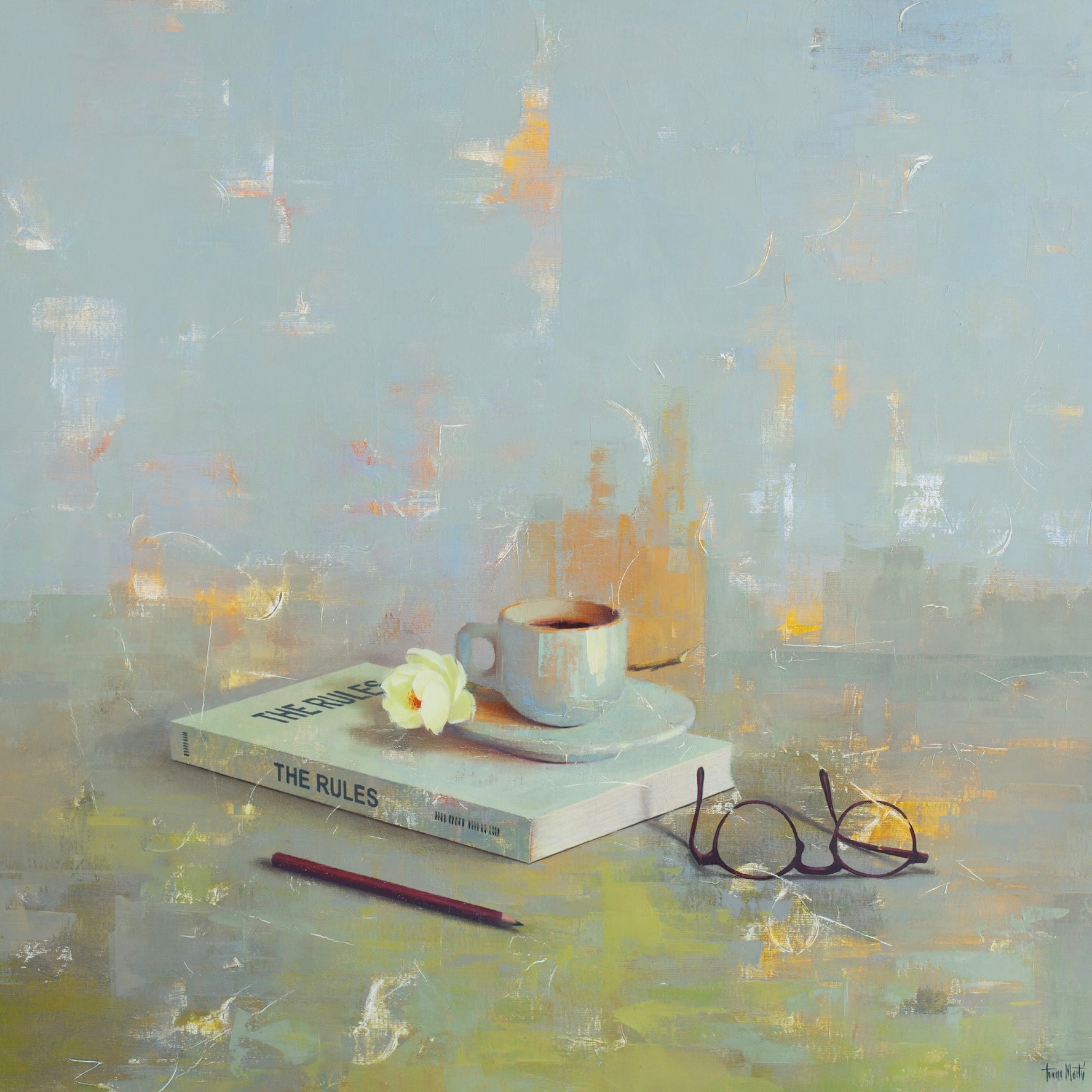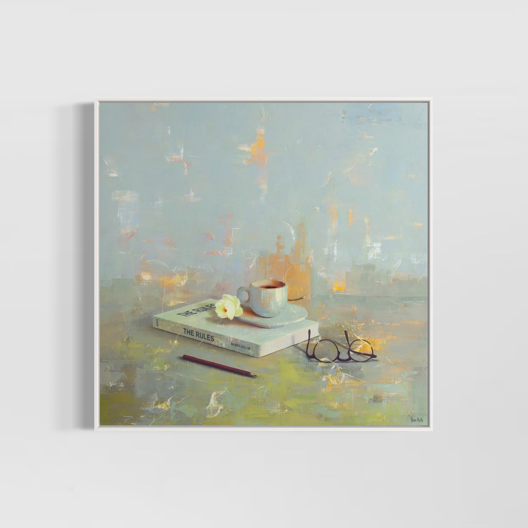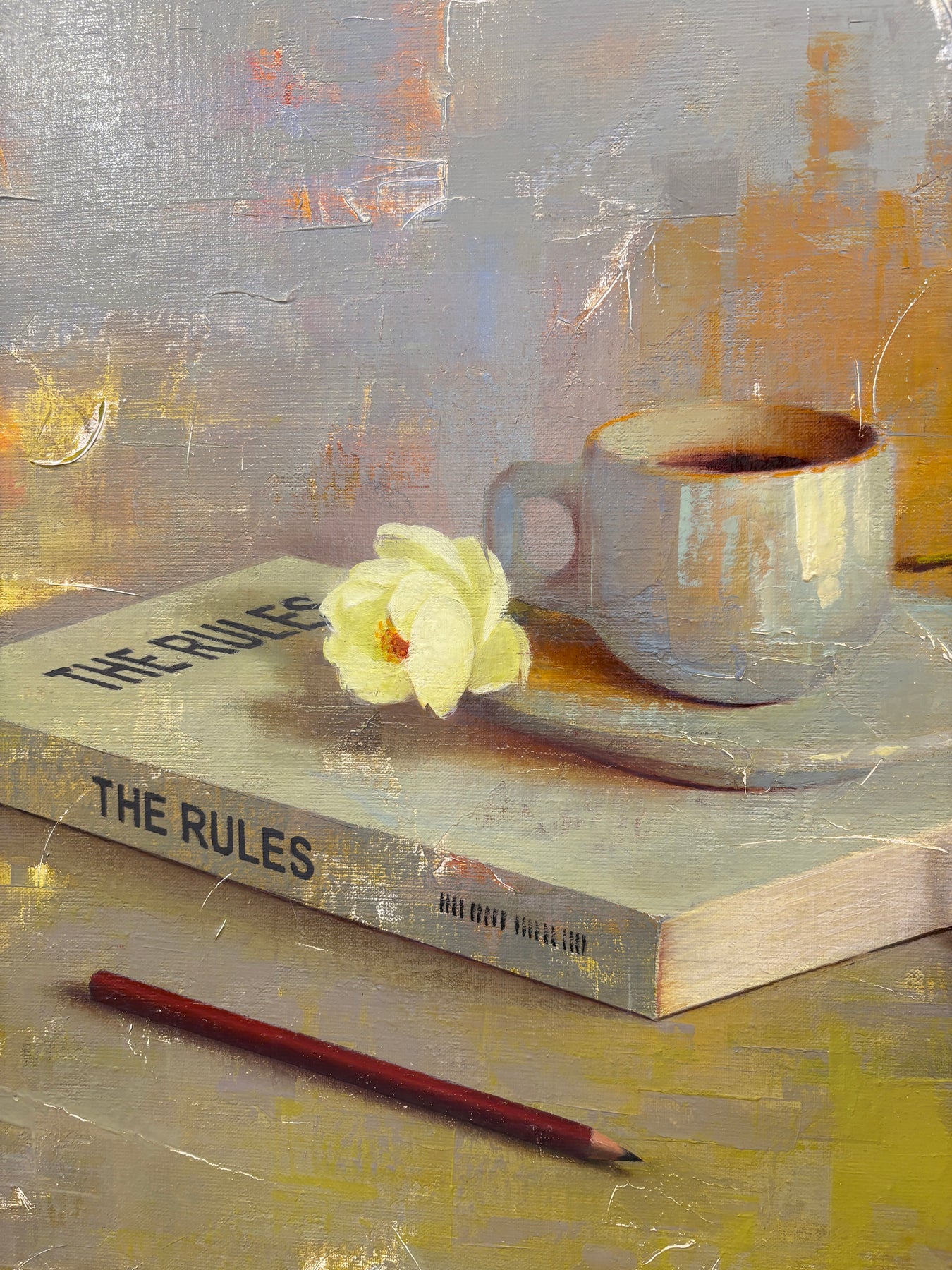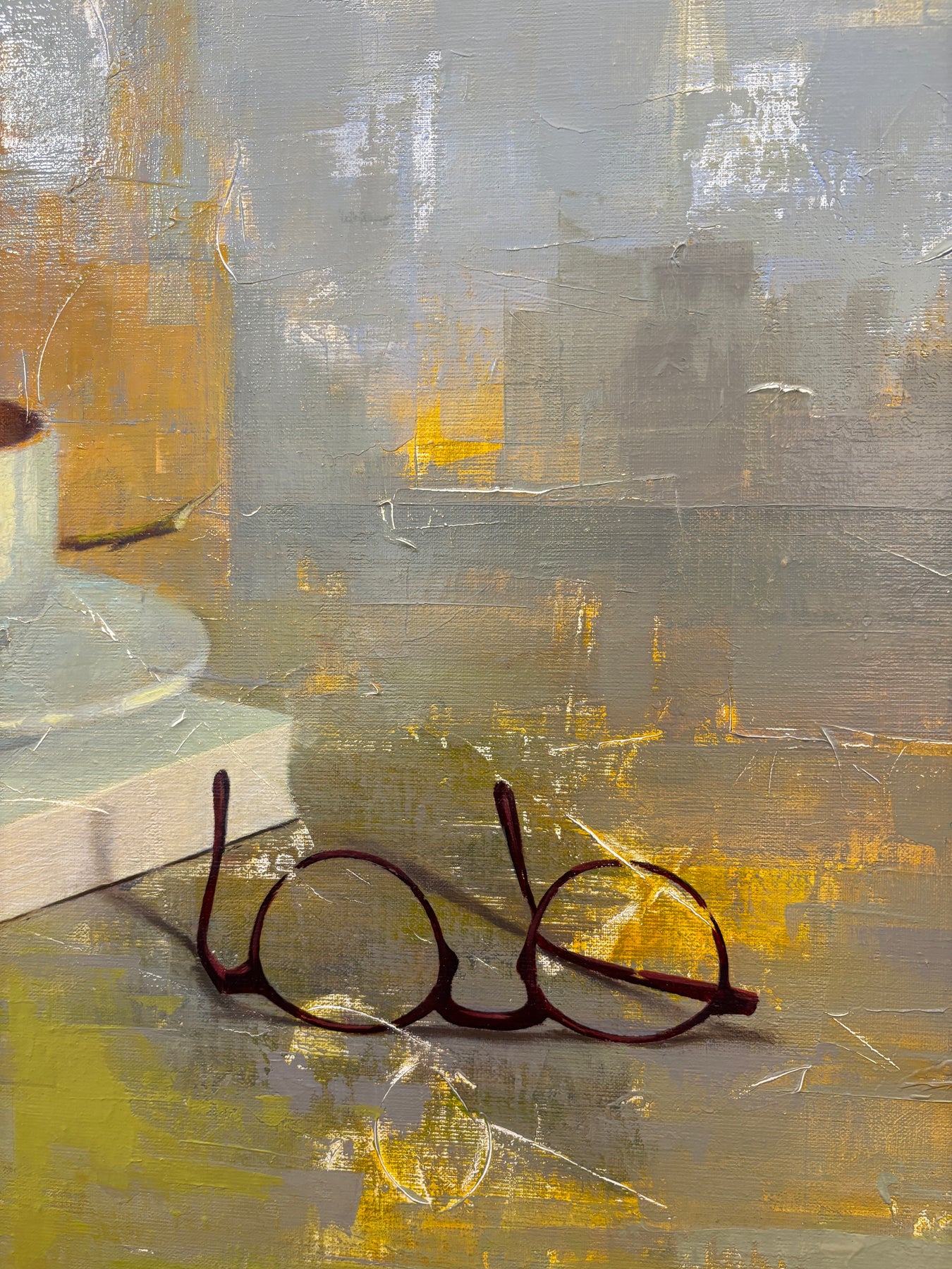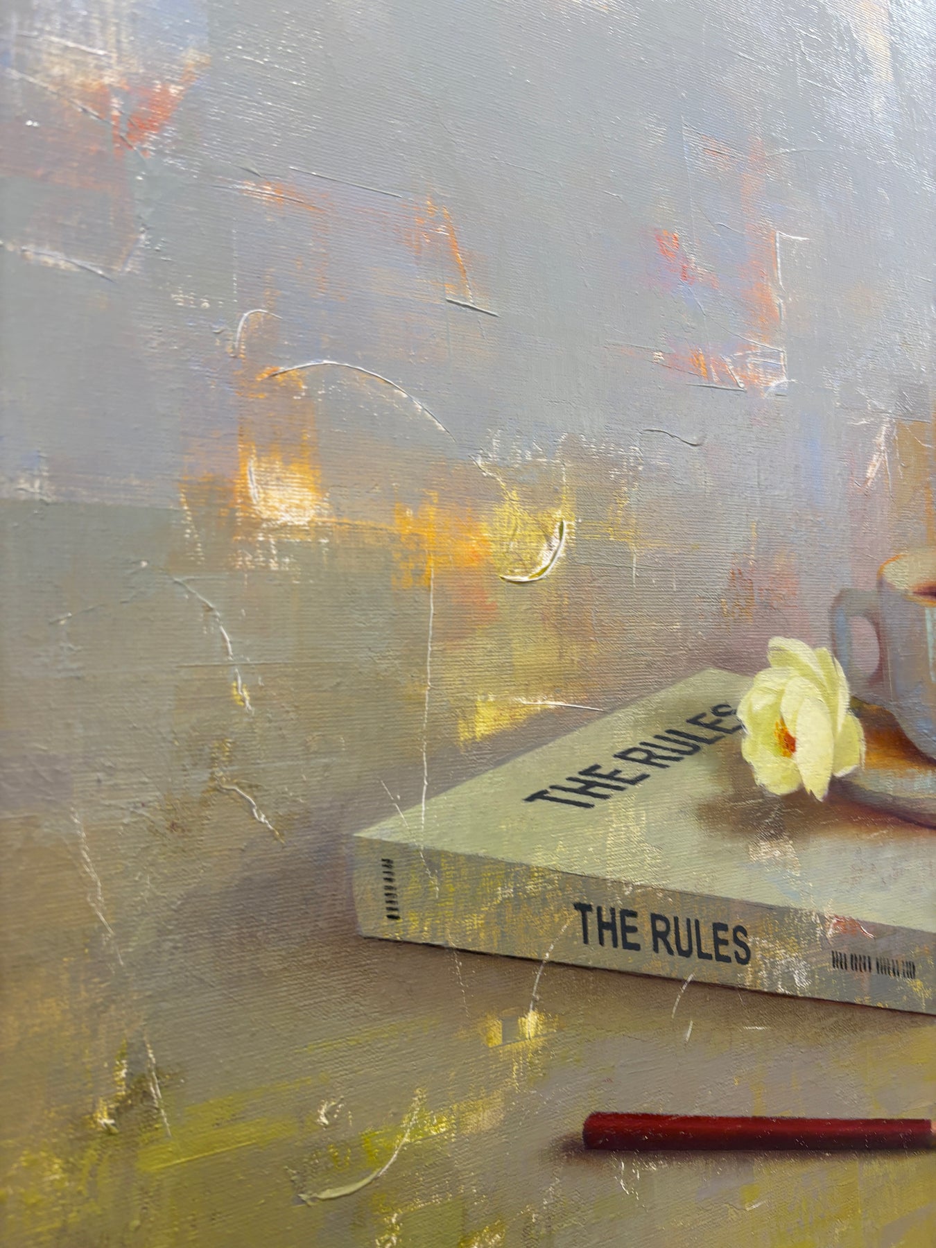 still life realism oil painting with book coffee glasses flower and pencil on surface in blue and green textured surface