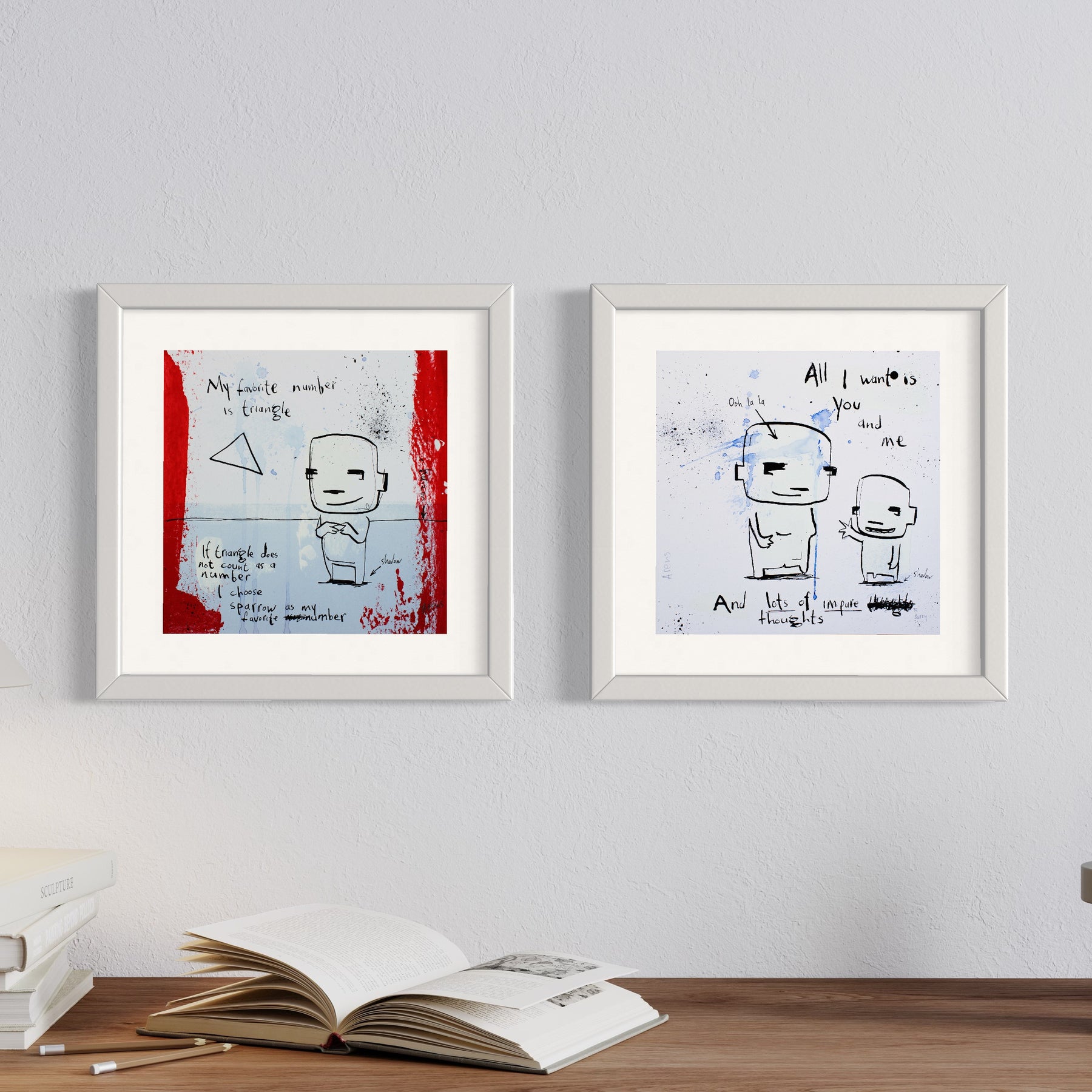 Concentrating on universally understood needs and emotions, Dutch artist Jan-Hein Arens is able to connect with every viewer and admirer of his works. Arens brings together humor and alienation through his paintings. The forefront is typically centered on a simplified figure and text that almost appears to be the thoughts of the figure. Often realistic drawings of body parts, common everyday objects or products are superimposed onto the foreground. Each piece is augmented with additional handwritten text detailing certain aspects of the piece in a comical tone. Paint splatters and rough brushstrokes fill out the remaining space in the paintings, allowing the figures and text to be the focus of each well-thought-out illustration.